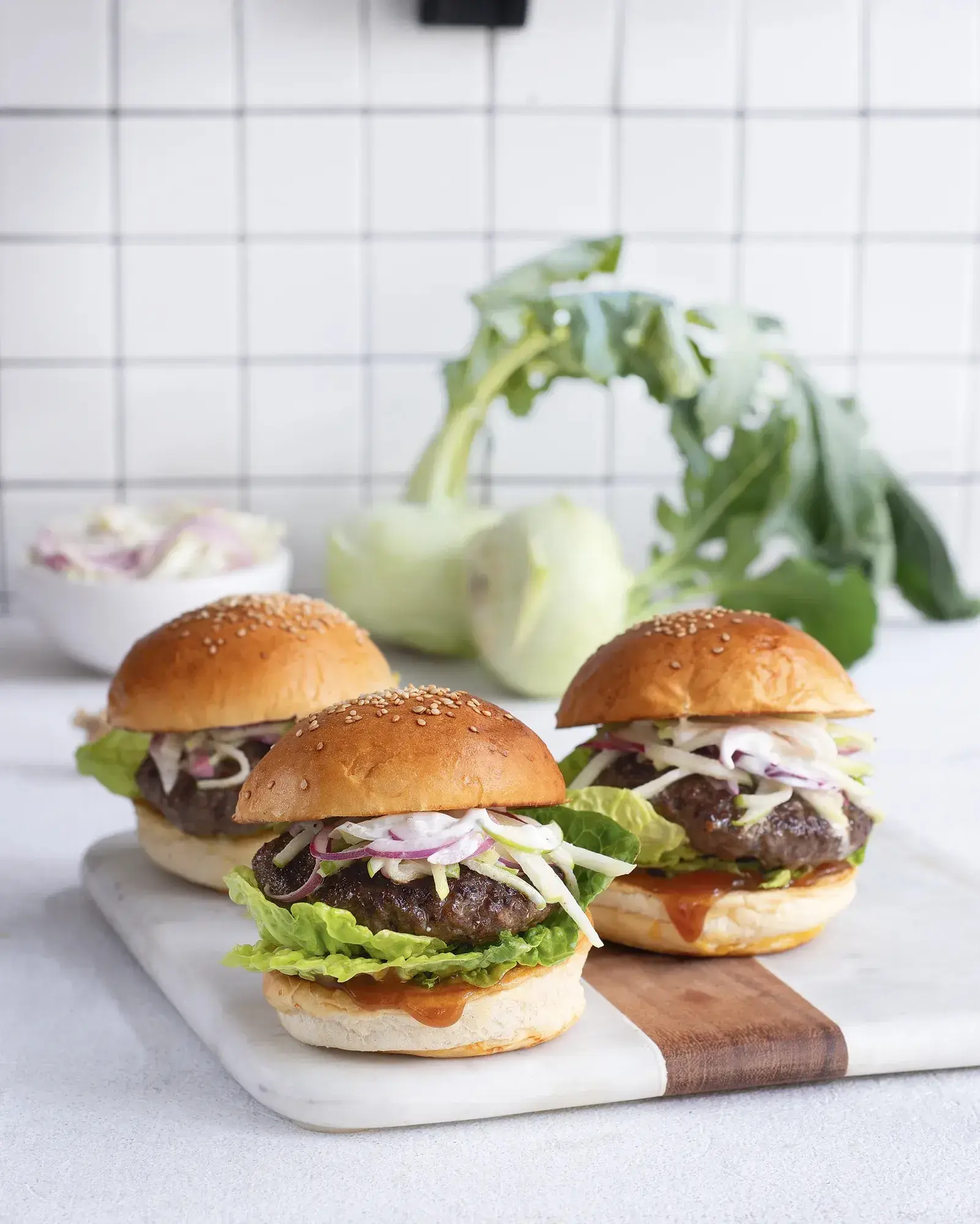Křupavá bulka, šťavnaté maso a coleslaw s netradičním složením, který si zamilujete na první ochutnání. Tyhle domácí hamburgery s kedlubnovým coleslawem budou chutnat každému!