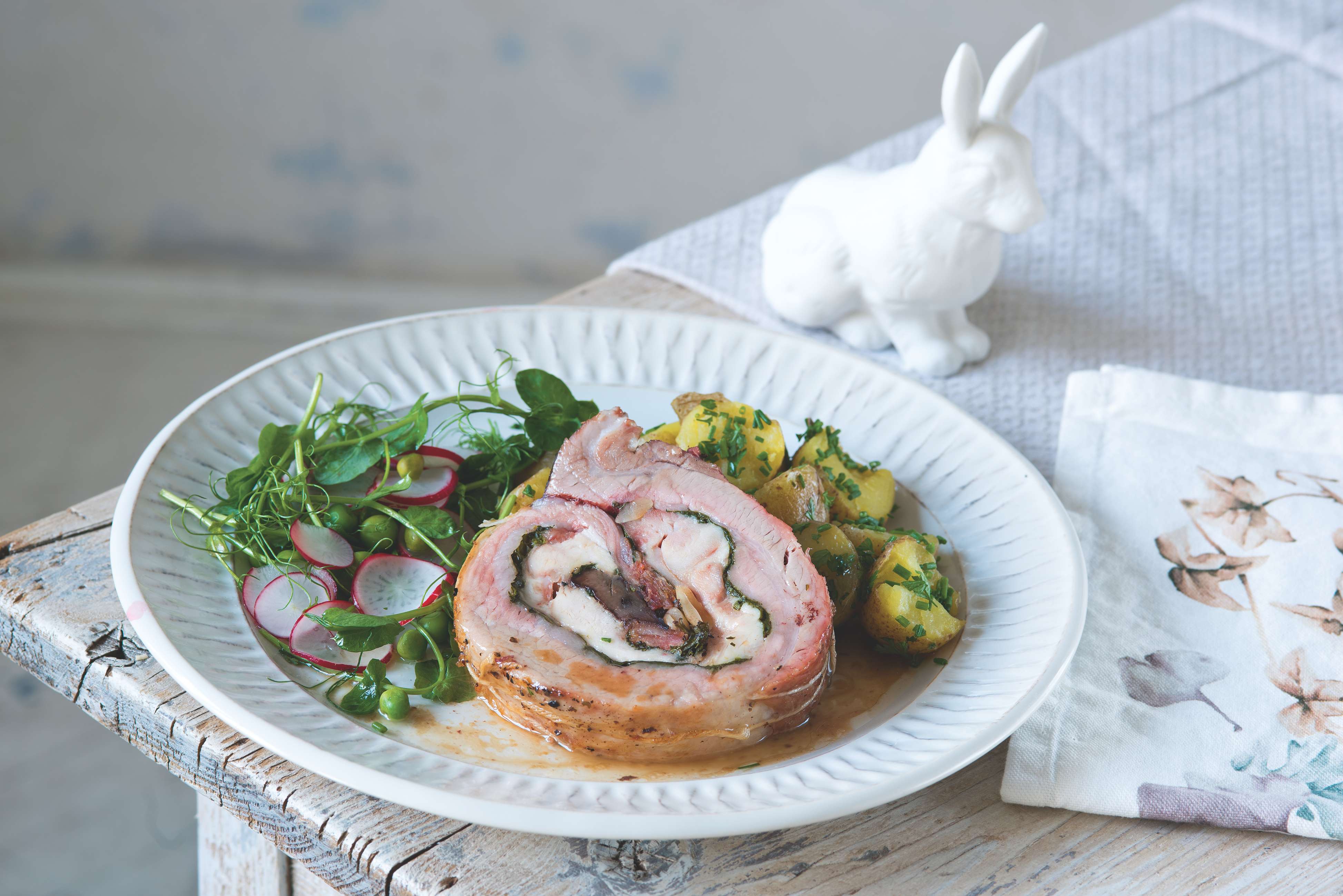 Luxusní trojctihodnou roládu skvěle doplní brambory plné bylinek, které jsou příjemně nasládlé a štiplavé.
