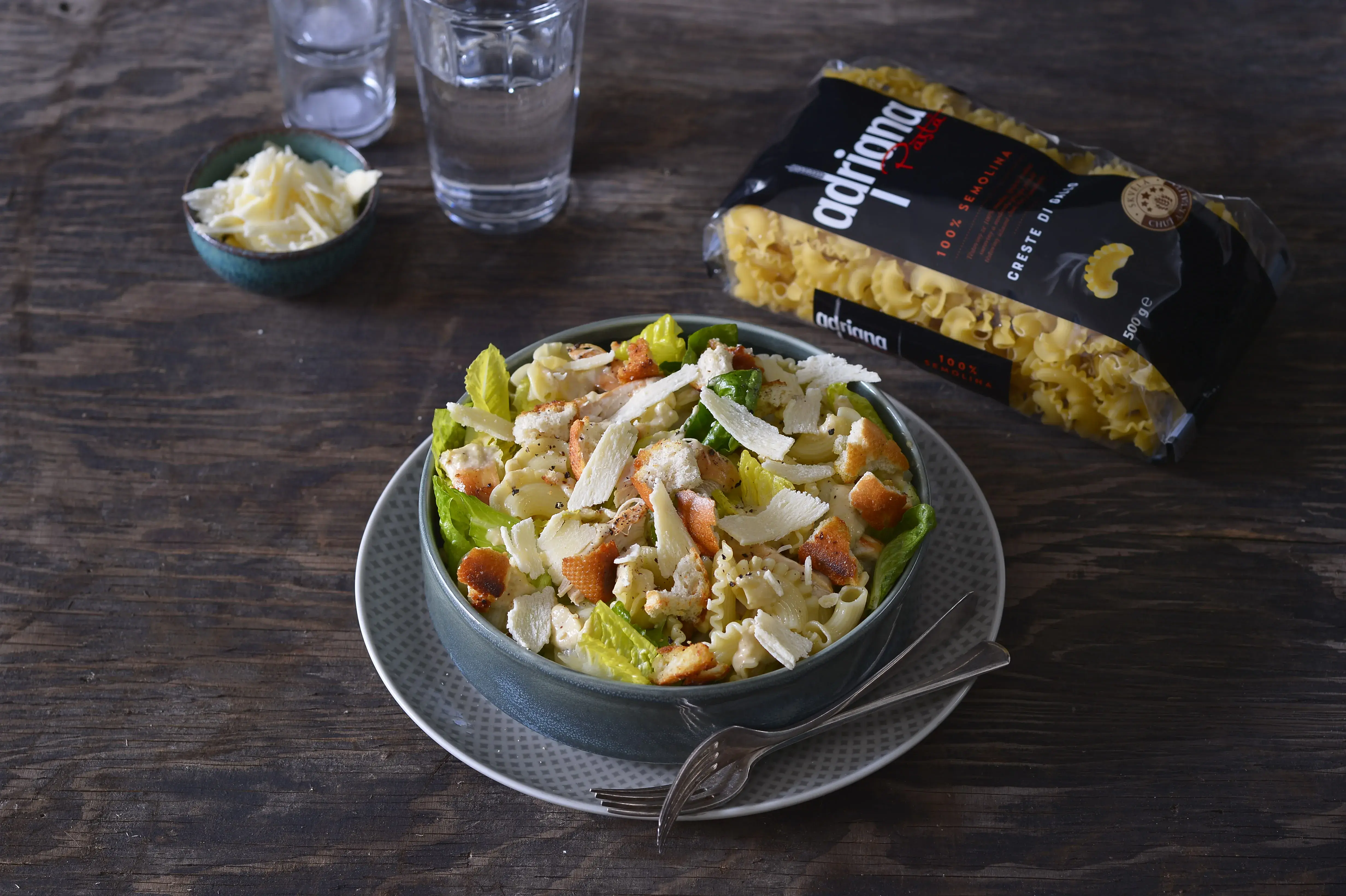 Vždy je dobré mít v zásobě balíčky kvalitních těstovin, častokrát totiž pomohou vyřešit otázku: „Co bude dnes k večeři?“ Stačí k nim přidat pár surovin a za chvíli můžete servírovat třeba Caesar salát s těstovinami Creste di gallo Adriana.