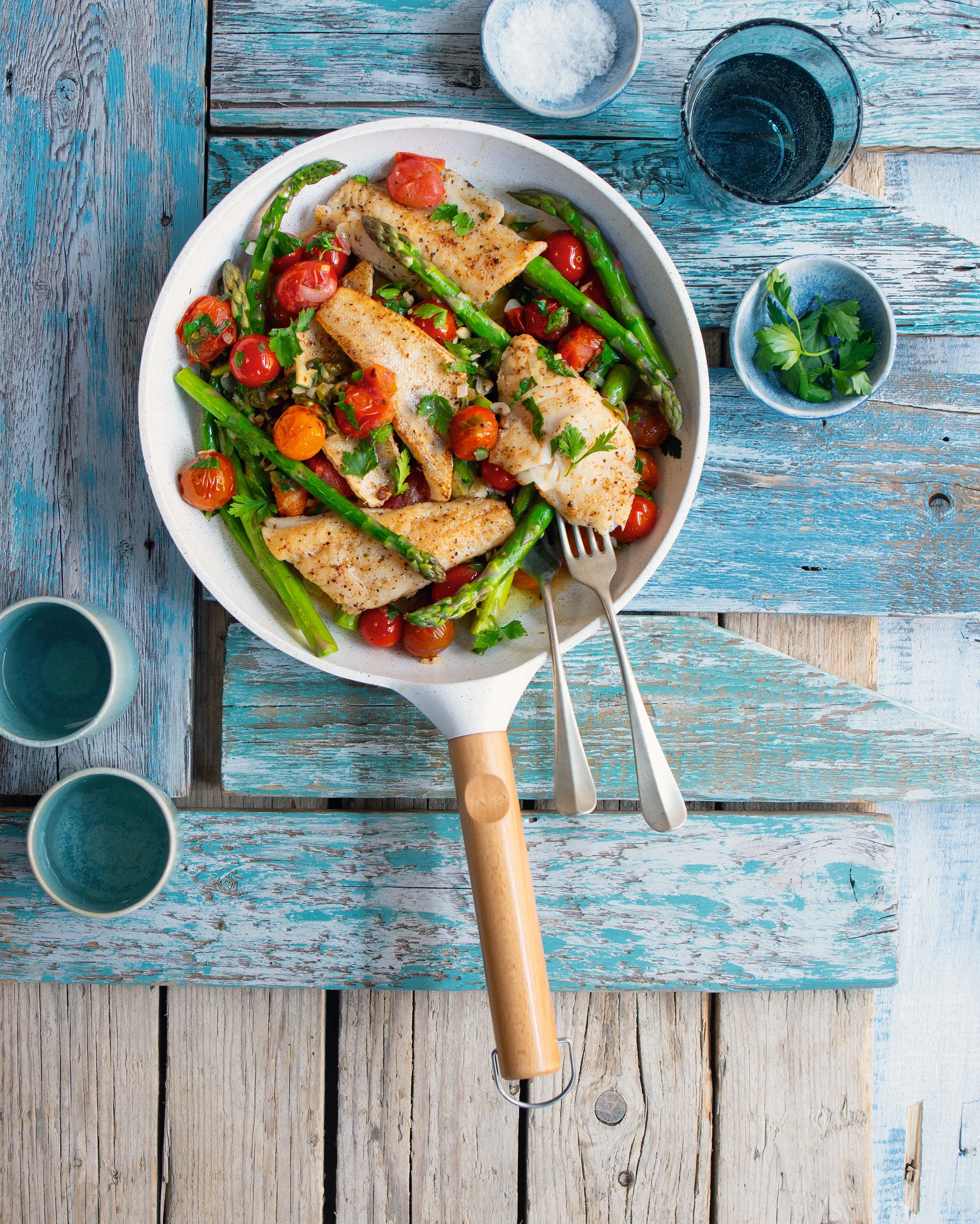 Candát s chřestem a rajčátky – jednoduchá, rychlá a lehká večeře plná barev i chutí. Můžete ji podávat s pečivem, s bramborami anebo jen se sklenkou vína.