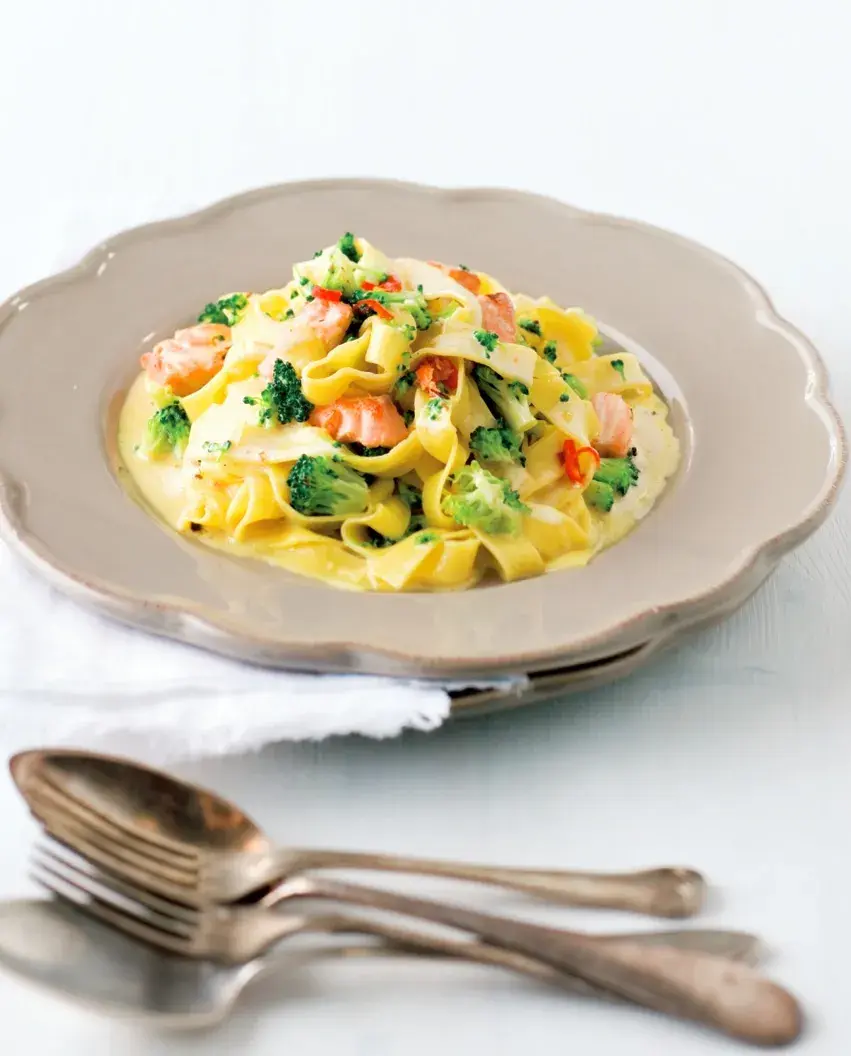 Krémová omáčka ze žloutků se obvykle k těstovinám připravuje se slaninou. S lososem a brokolicí však stojí také za ochutnání.