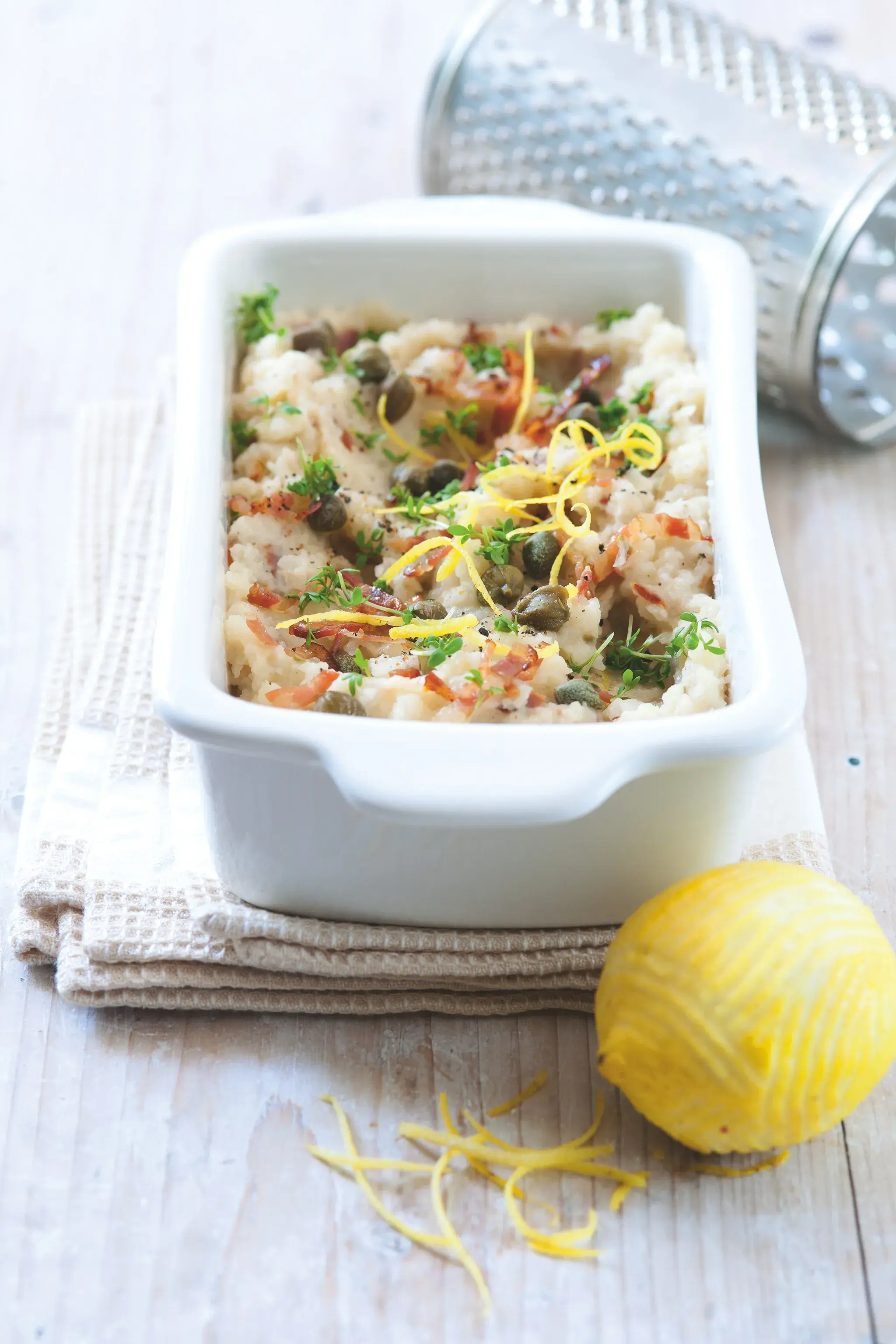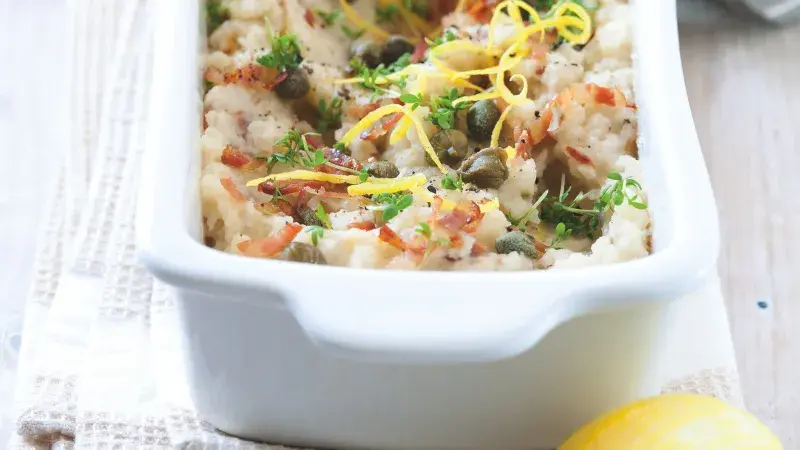 Kaše po italsku s opečenými kousky pancetty a výraznými kapary.