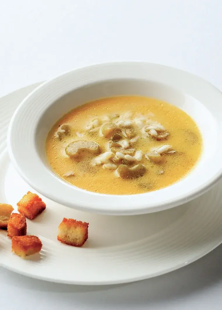 Výrazná chuť česneku, sherry, na zjemnění smetana a jako třešnička na dortu špetka šafránu.