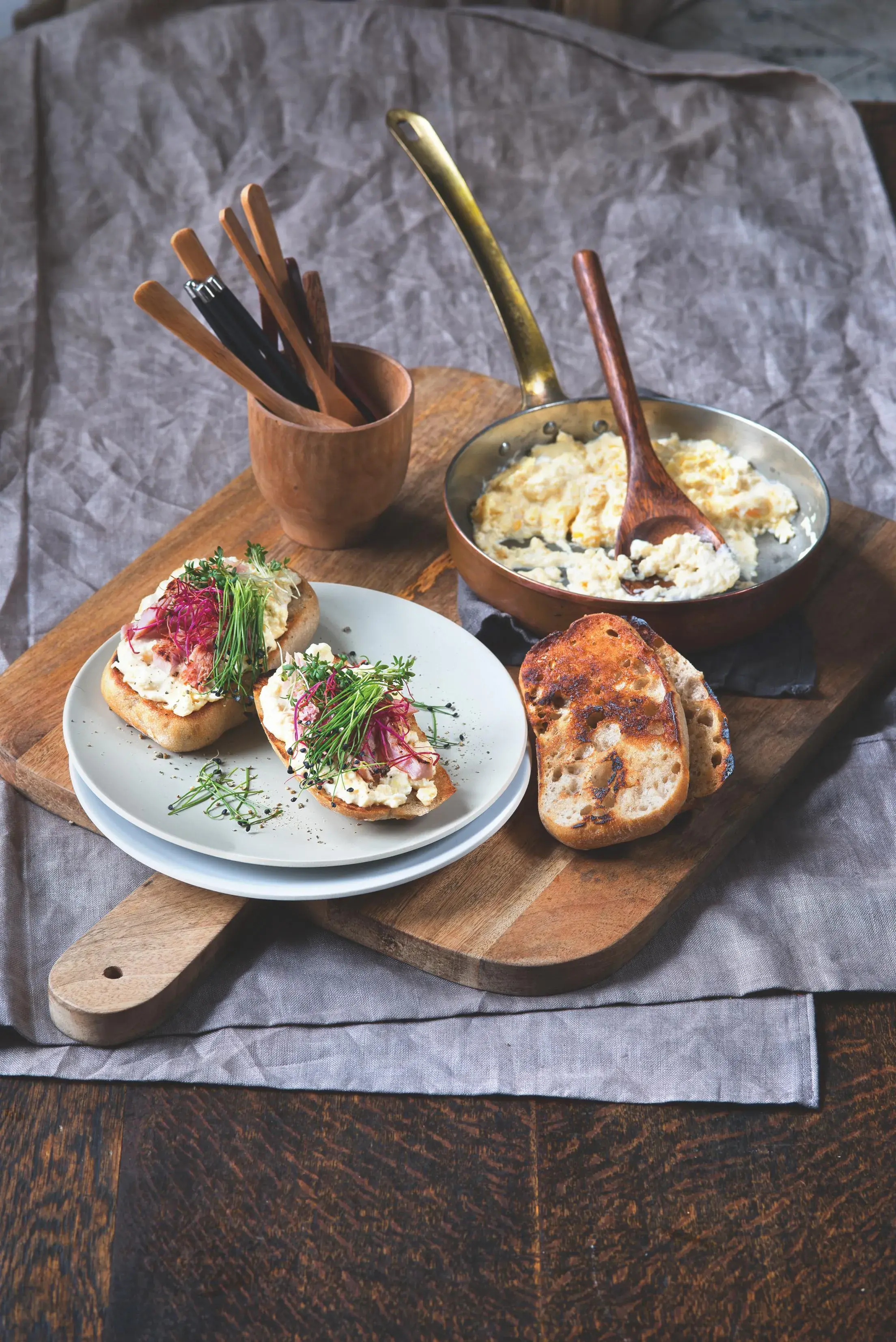 Míchaná vajíčka získají díky mascarpone na krémovosti. S čerstvým pečivem a bylinkami mohou být chlebíčky s míchanými vejci a šunkou skvělou rychlou večeří.