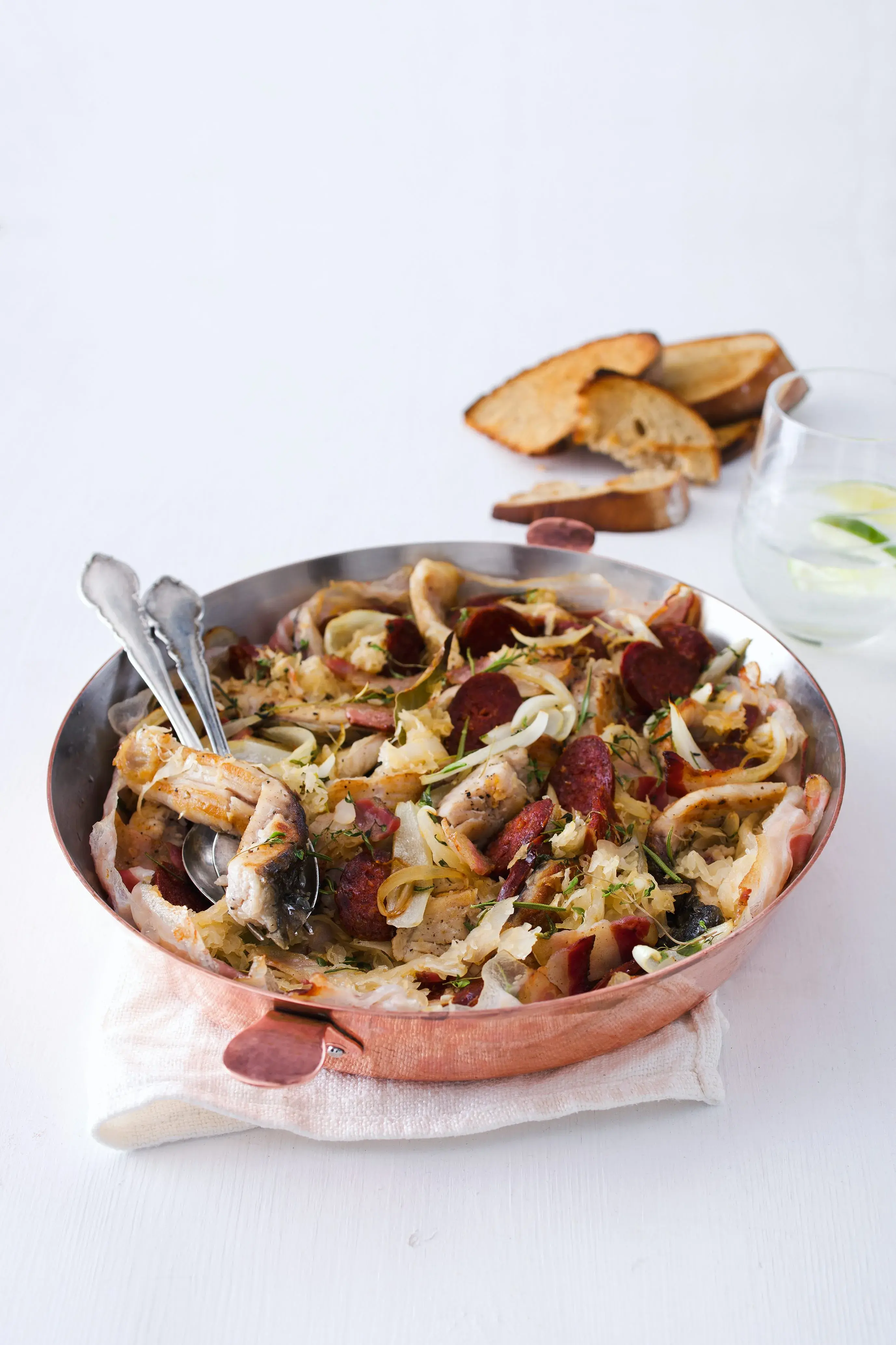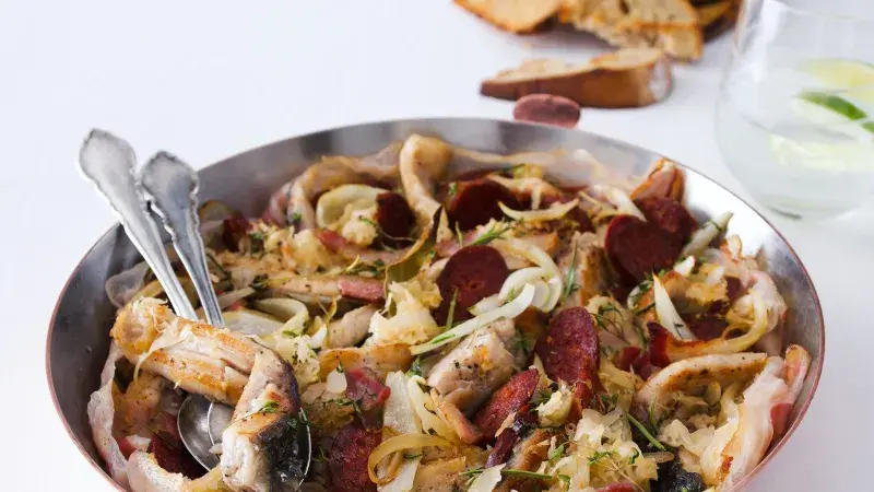 Název téhle alsaské speciality (čtěte šukrut) je francouzskou zkomoleninou německého sauerkraut neboli kysané zelí. Tradičně se dělá s výběrem uzenin, ale naše speciální verze s rybou si své příznivce jistě najde.