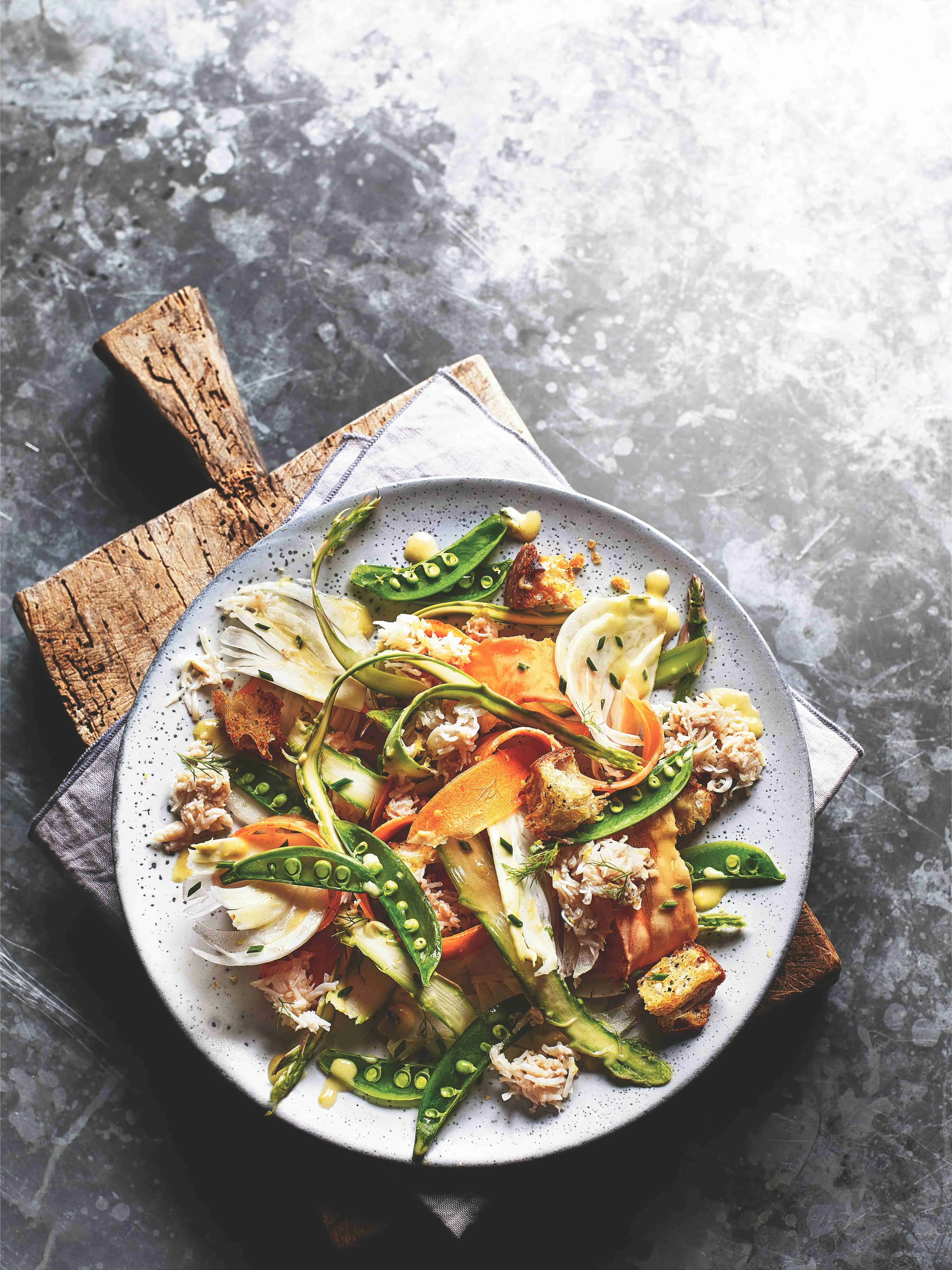 Křupavá slaďounká červnová zelenina si zaslouží luxusní doprovod, jako je třeba jemné krabí maso.