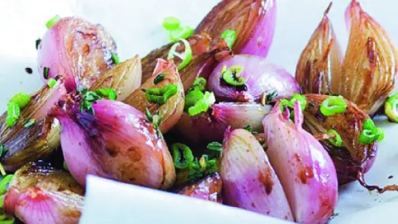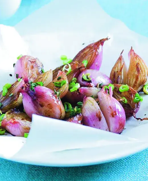 Malé cibulky s voňavým tymiánem a vařené v lahodné šťávě. Báječná příloha.