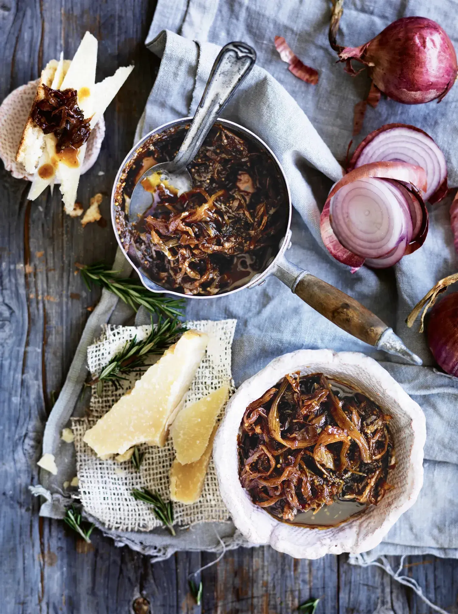 Karamelizovaná cibule je skvělá jako příloha k sýrovému prkénku, ale můžete ji dát i do hamburgerů, sendvičů, zapečených toastů nebo do salátu. Cibulový džem s rozmarýnem a fenyklem představuje další možnost, jak elegantně zpracovat cibuli a uchovat si její báječnou chuť i během zimy.