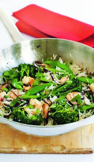 Voňavou jasmínovou rýži osmahněte s fazolkami a hráškem, podávejte s omeletami a klobáskami.