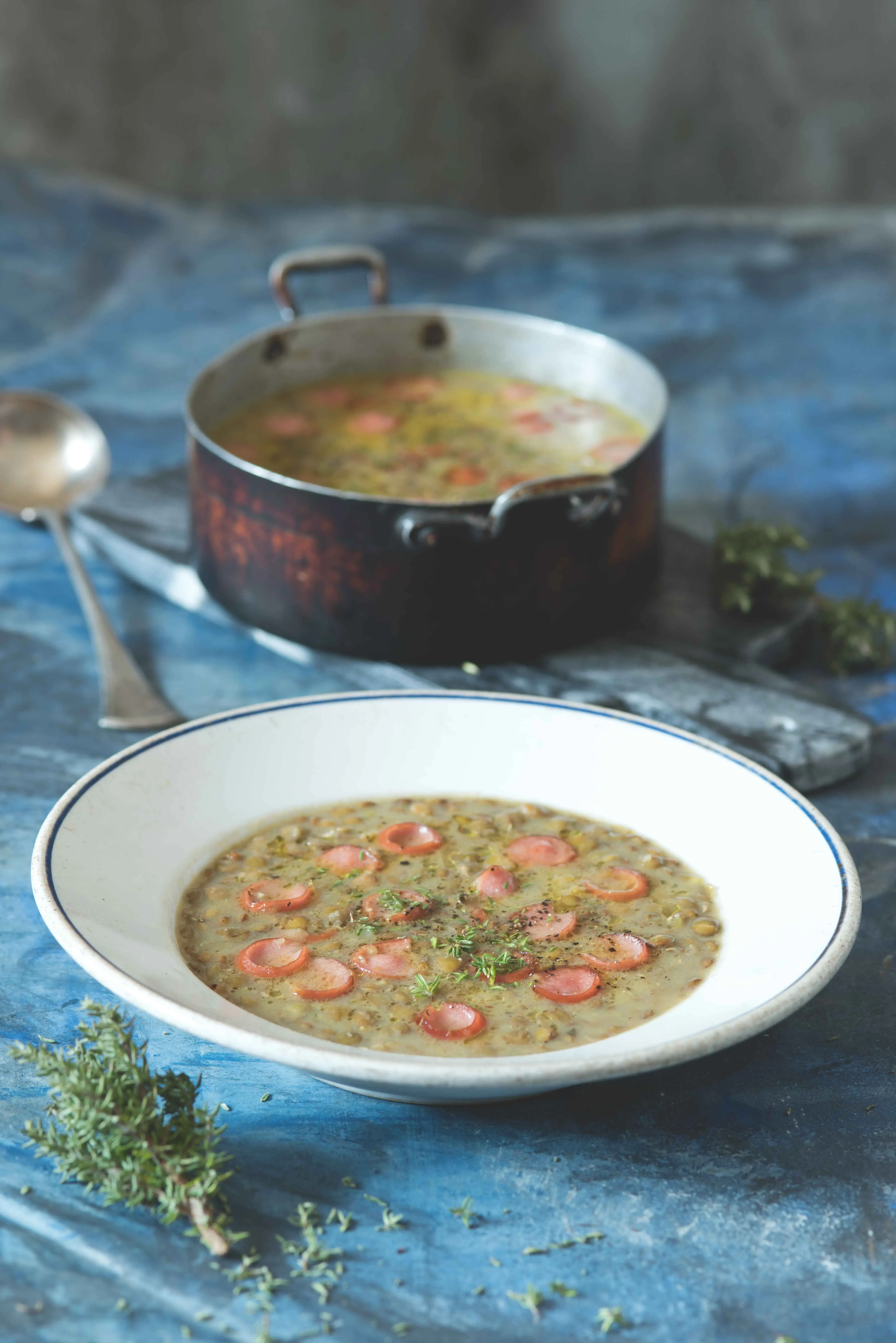 Spousta muziky za málo peněz – tahle čočková polévka je úplně jednoduchá, vystačí s minimem obyčejných surovin, ale na focení se po ní jen zaprášilo. Snad proto, že právě takové se jedly v dobách našeho dětství. Čočková polévka s párkem a tymiánem může být i pro vás příjemnou nostalgií, jejíž recept je nutné si pořád a dokola připomínat. Tak tady je.