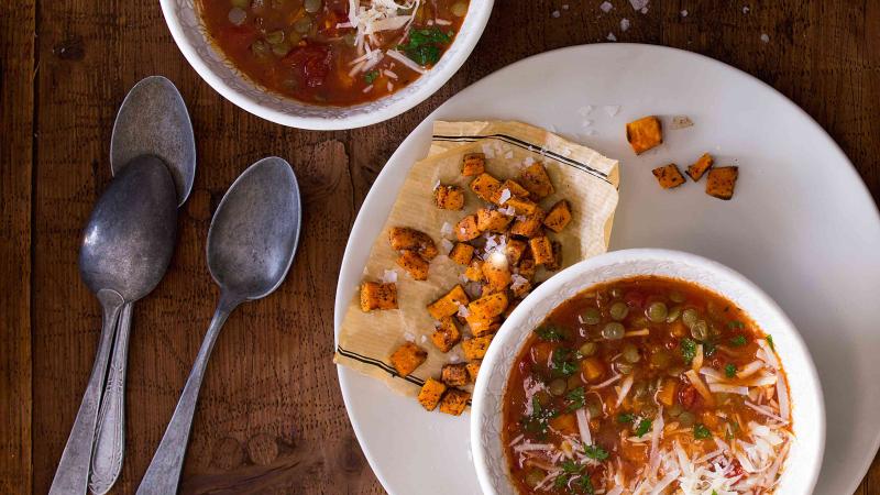 Talíř syté polévky s originálními batátovými krutonky vás zahřeje na těle i na duši.