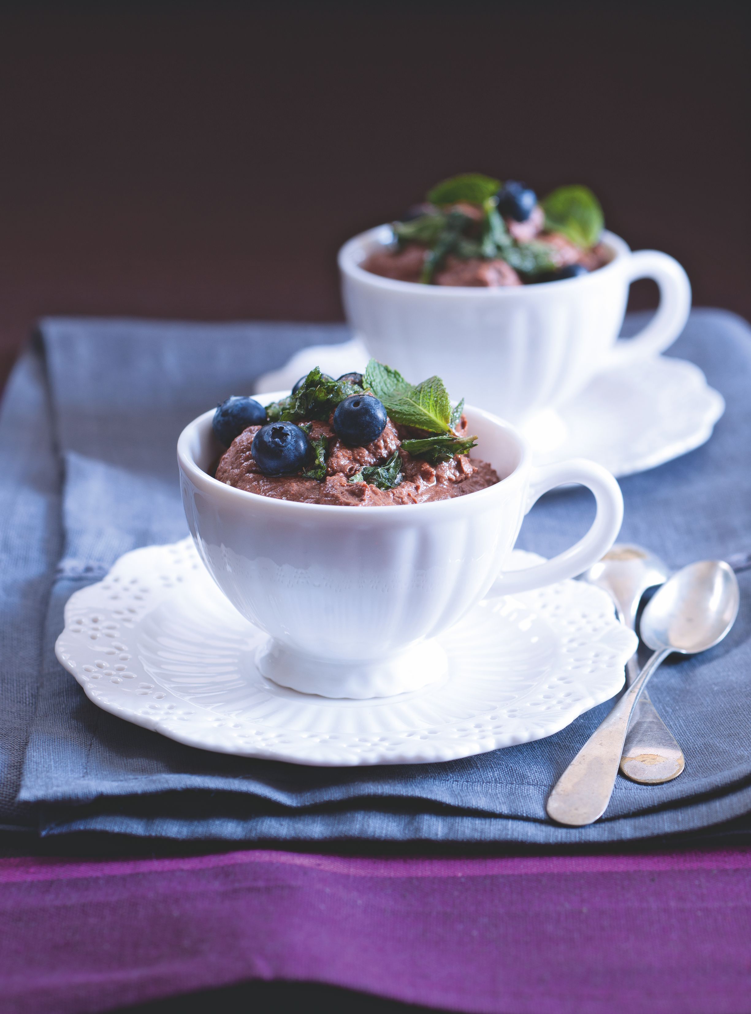 Pěna z našlehaného mascarpone se smetanou a z kvalitní tmavé čokolády je vysoce návyková záležitost. A to nemluvíme o mátové drti s borůvkami…