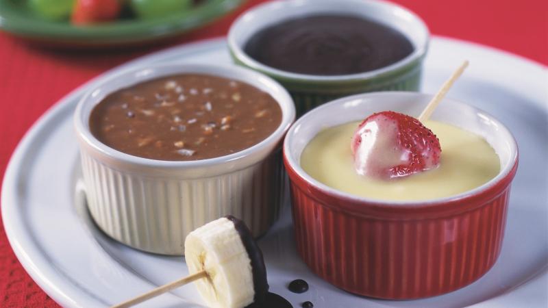 Tak snadné, a přitom efektní! Jen mějte plamen pod nádobou na fondue pod neustálým dozorem – anebo do ní postavte misku s vodou a dál čokoládu prohřívejte na vodní lázni, aby se nic nepřipálilo.