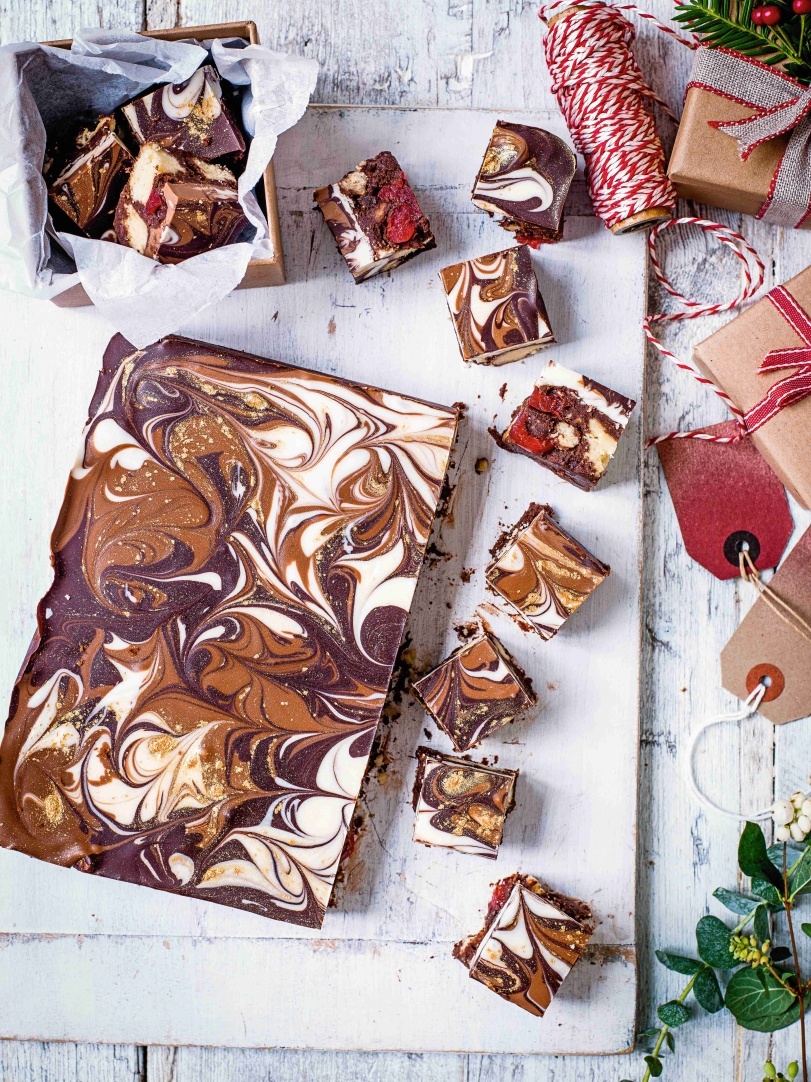 Těmto čokoládovým kostkám se angličtině říká tiffins – čtverečky (nebo obdélníčky) čokolády smíchané se sušenkou a sušeným ovocem. Jsou ideálním jedlým dárkem pro každého mlsouna s vybranými chutěmi.