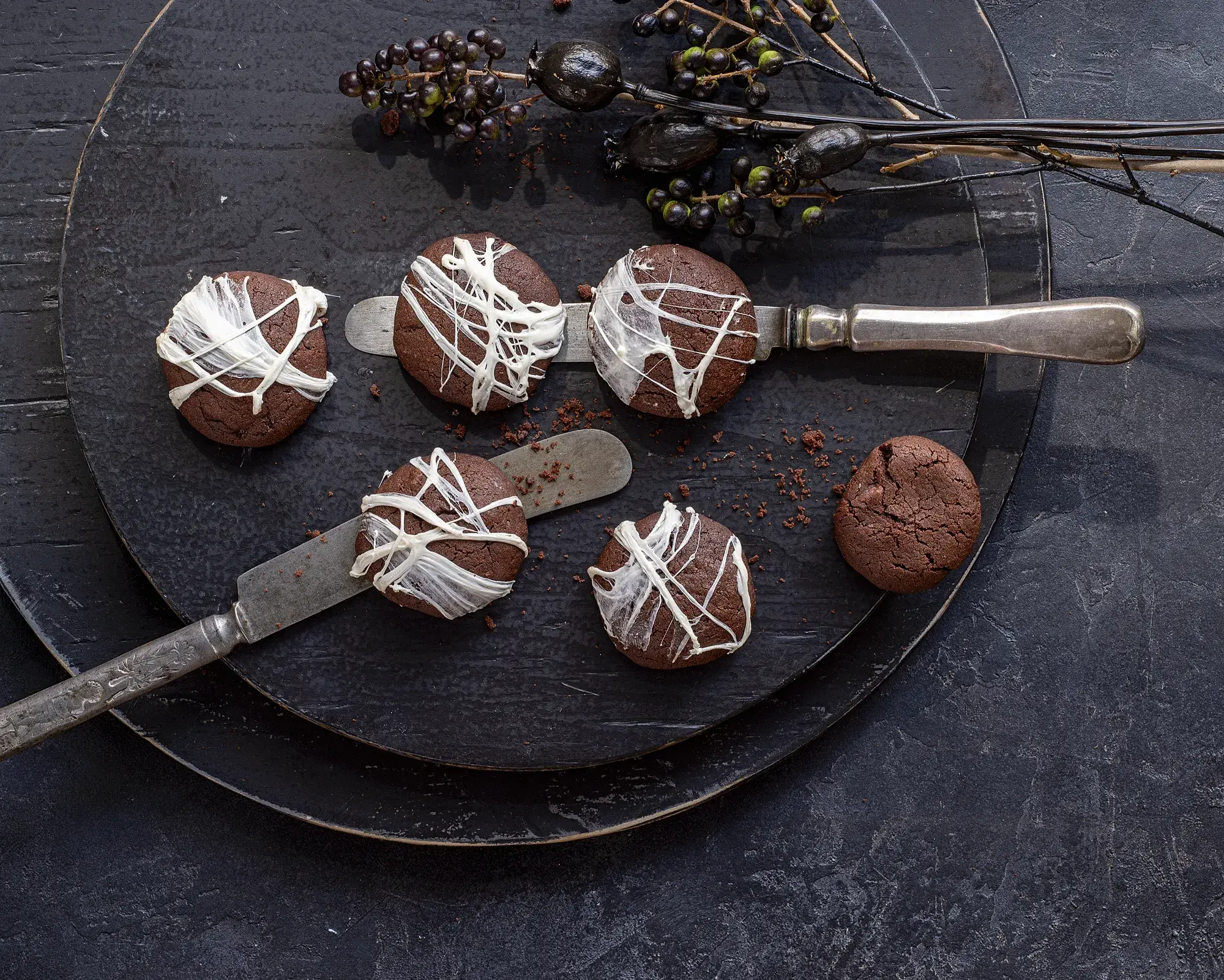 Jednoduchý trik, jak proměnit čokoládové sušenky v halloweenskou pochoutku, je využít rozehřáté marshmallow. Hmota vytvoří efekt pavučiny a sušenkám dodá svou charakteristickou sladkou chuť. Pro dokonalý efekt doporučujeme černé kakao a bílé pěnové bonbony.