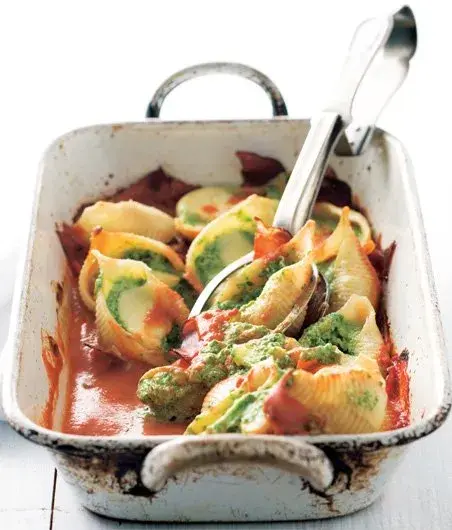 Conchiglioni jsou velké lastury vhodné k plnění. V tomto receptu do nich patří špenát, rajčatové pyré a sýry. Další variace jsou jen na vás.