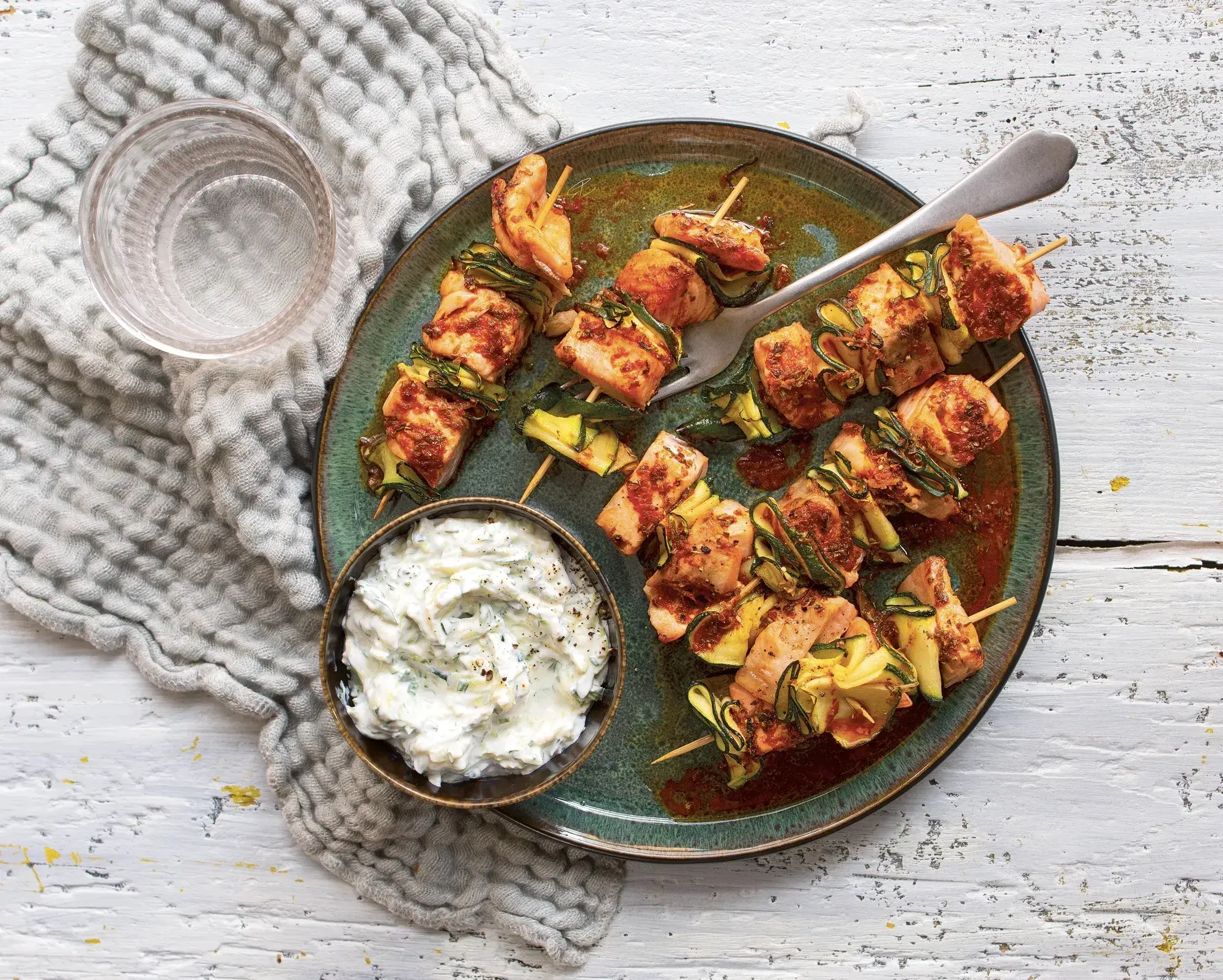 Napadlo nás napíchnout lososa a cuketu na jehlu a hodit na rozpálený gril. Do teď se tetelíme radostí, jak dobrý nápad to byl. A tzatziki z cukety dodaly jídlu tu pravou středomořskou tečku. Zapomeňte na steaky, toto je pravá chuť léta...