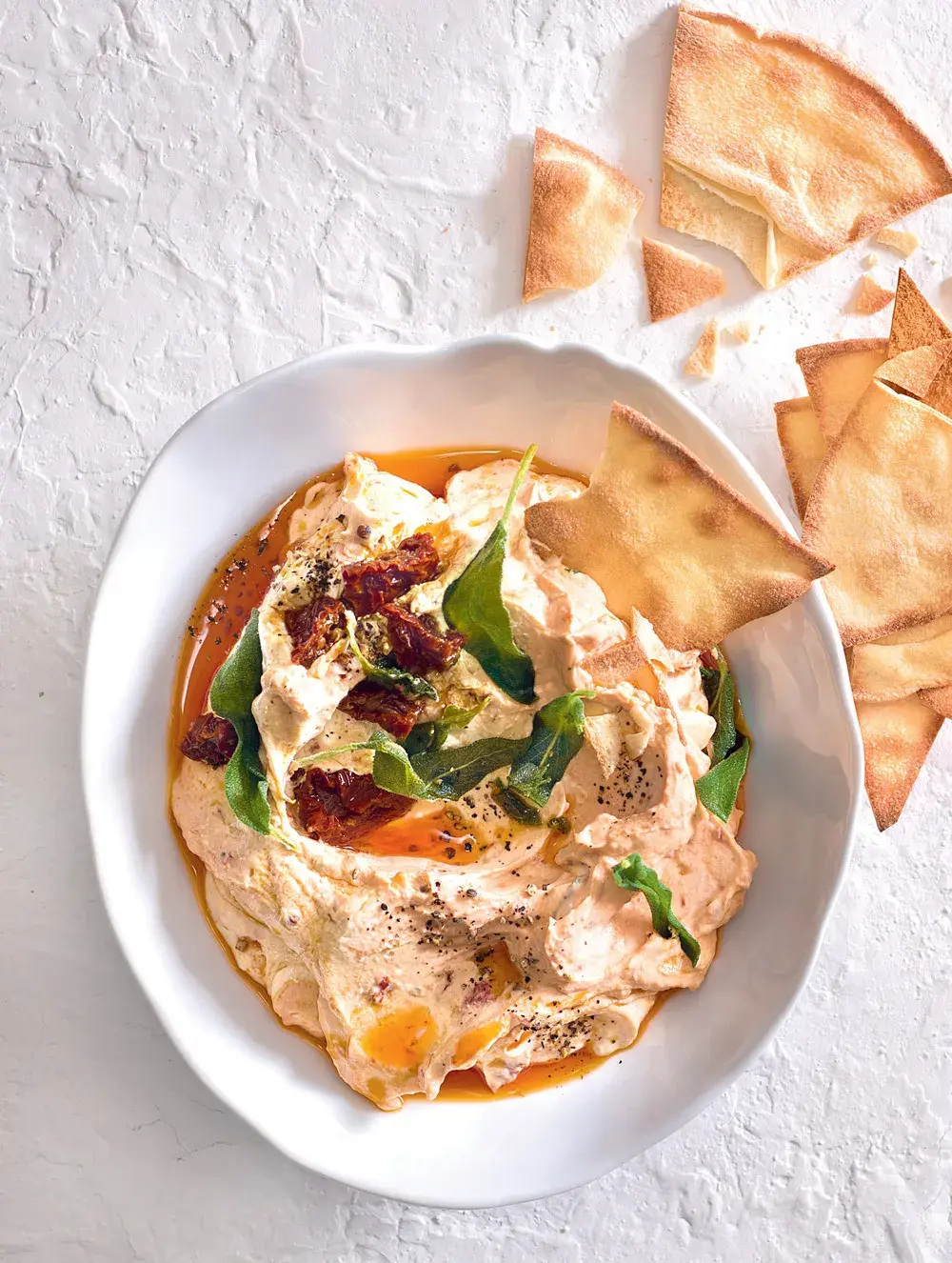 Výrazný kozí sýr skvěle doplňuje jemné mascarpone a sušená rajčata.