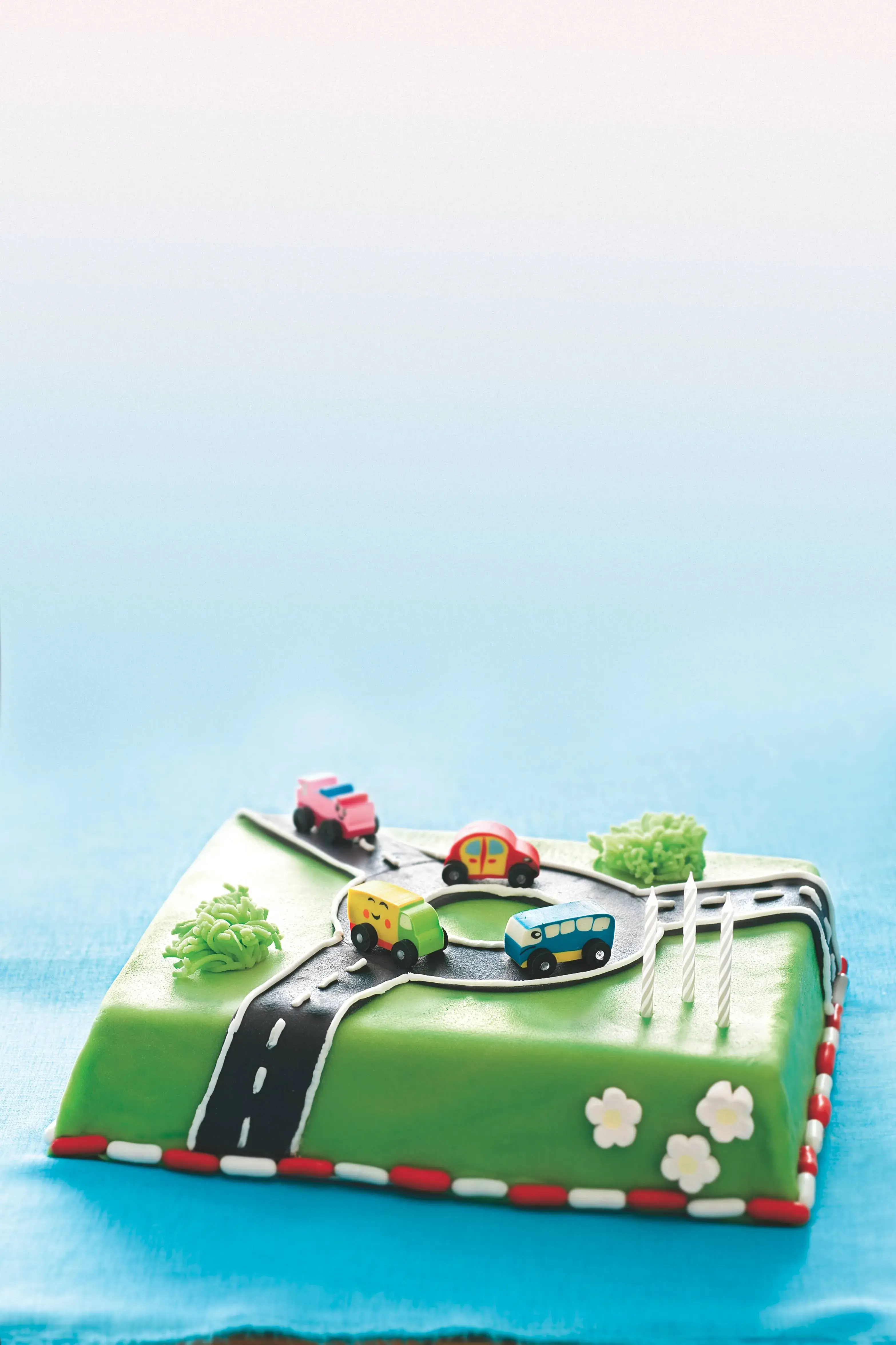 Pod marcipánovou krajinou se skrývá sametový čokoládový dort. Pokud se vám zdá vykrajování kruhového objezdu komplikované, udělejte na dortu jen rovnou silnici.