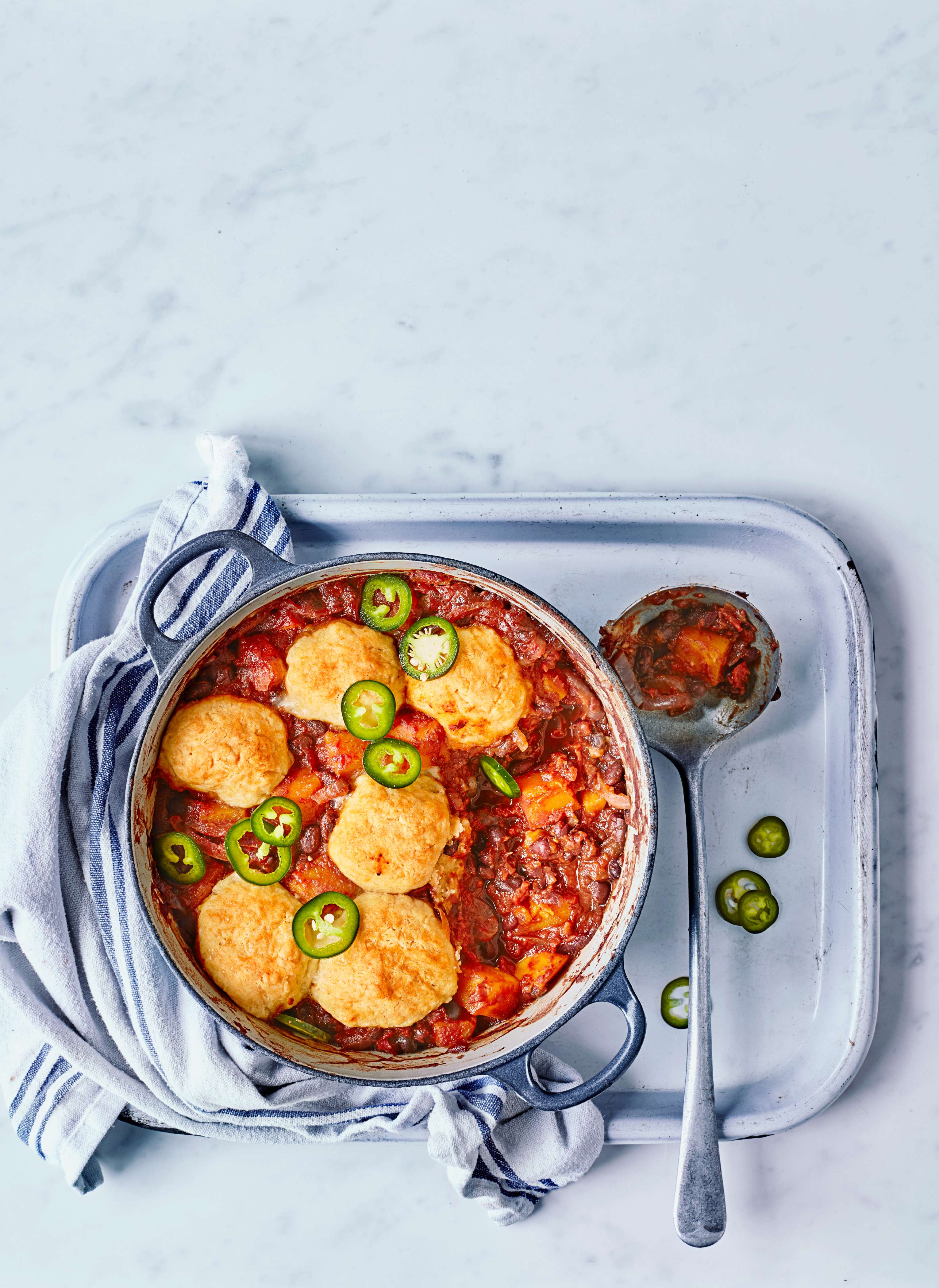 Směs batátů, černých fazolí a rajčat je výživná a lahodná sama o sobě. Když ji ovšem ukryjete pod čedarové knedlíčky, které jsou uvnitř vláčné a na povrchu krásně dozlatova vypečené, vznikne opravdu zábavné jídlo, kterého se nebude moci nabažit celá rodina.
