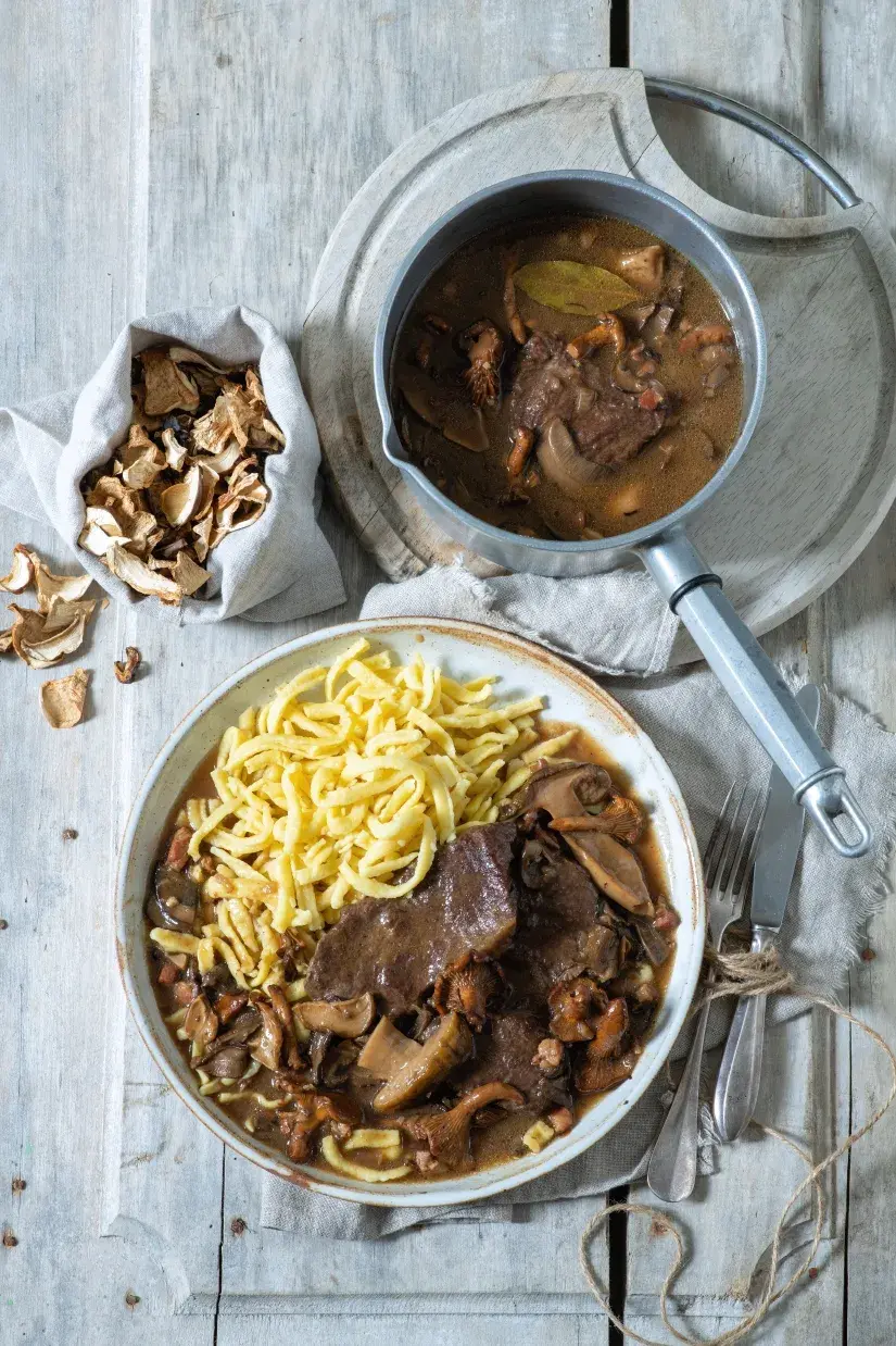 Hovězí na houbách je (nejen) podzimní klasika. Přidejte víno a ze skvělého jídla se stane naprosto luxusní záležitost. Obvyklou rýži zkuste tentokrát nahradit špeclemi.