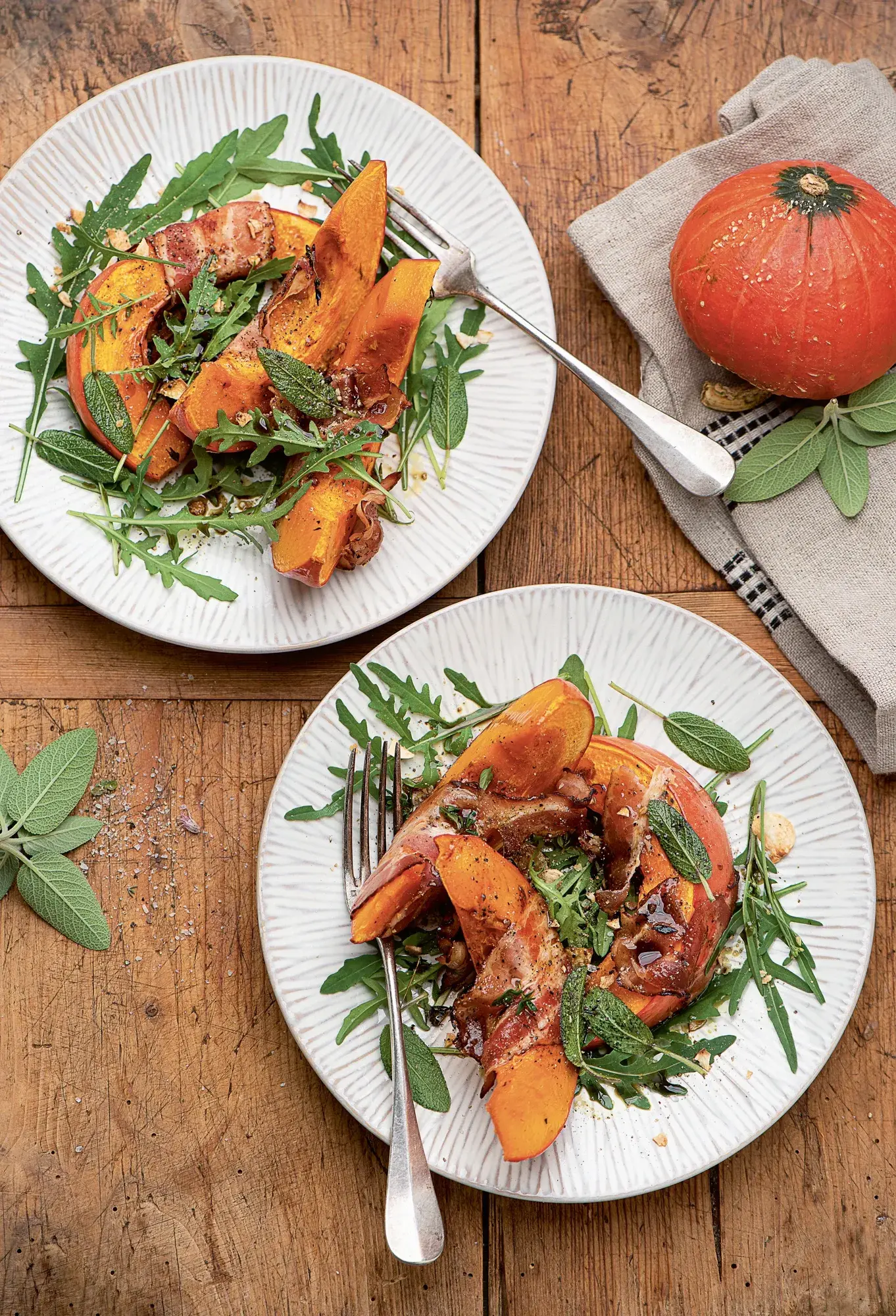 Jednoduchý teplý salát z pečené dýně a křupavé slaniny připravíte během chvilky. Křupavá rukola a jednoduchá zálivka se k této podzimní variaci báječně hodí. Pokud chcete mít salát sytější, přidejte vařený kuskus a zasypte rozdrobenou fetou. Vsadit můžete i na opražená dýňová semínka.