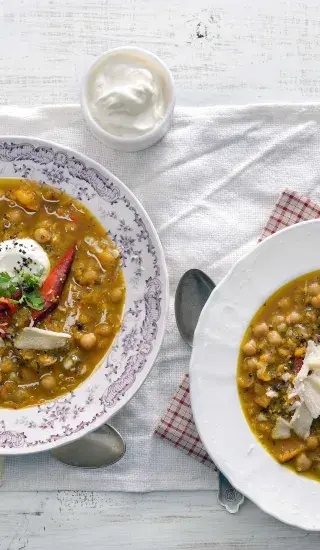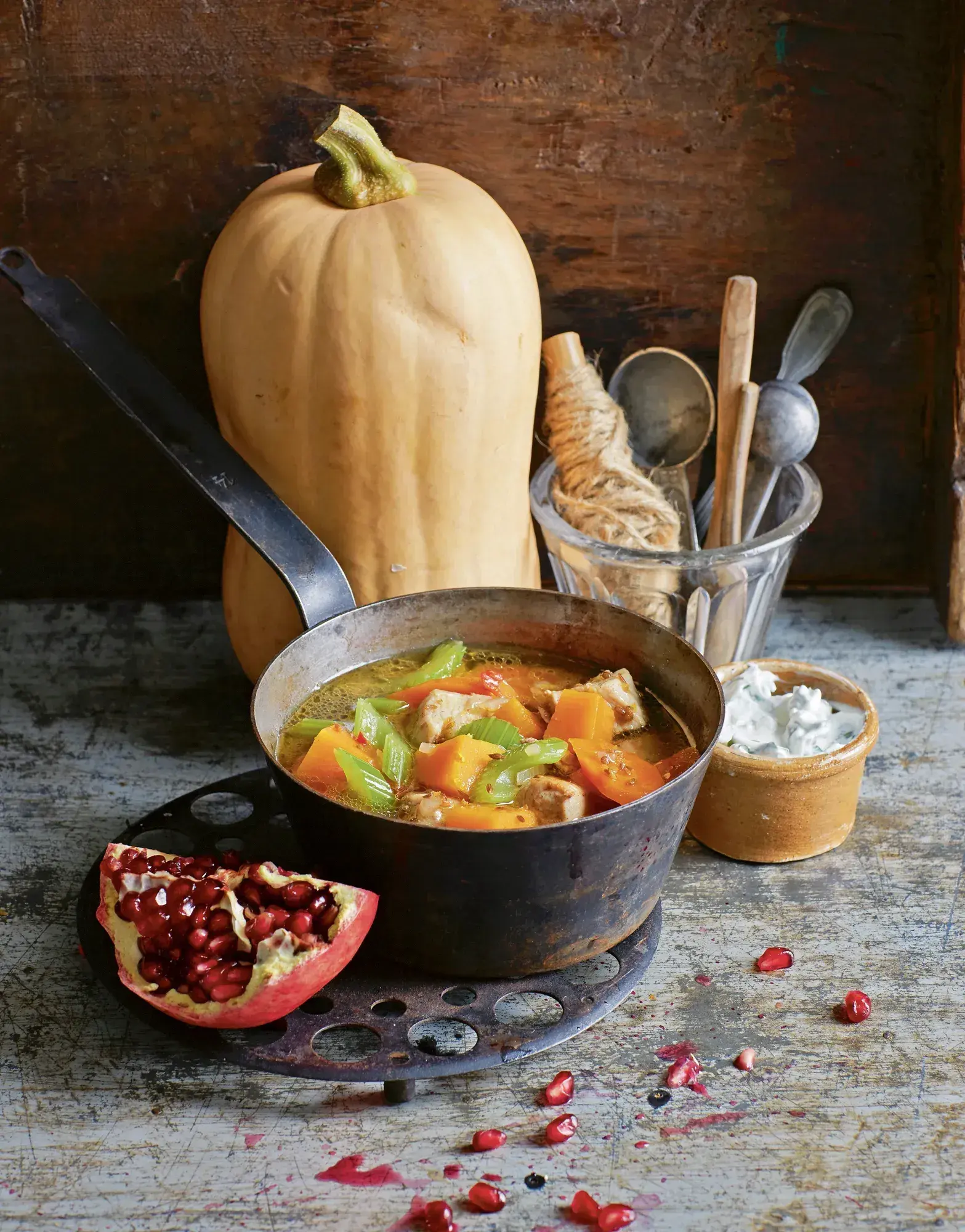 Vydatná pikantní dýňová polévka s kuřetem vás svou chutí přenese na Střední východ. Nejde o žádný jemný krém, ale poctivou polévku plnou kousků zeleniny, masa a koření. Jemný mátový jogurt a semínka granátového jablka z ní udělají syté jídlo, jako stvořené pro rodinnou večeři nebo svačinu na zahřátí.