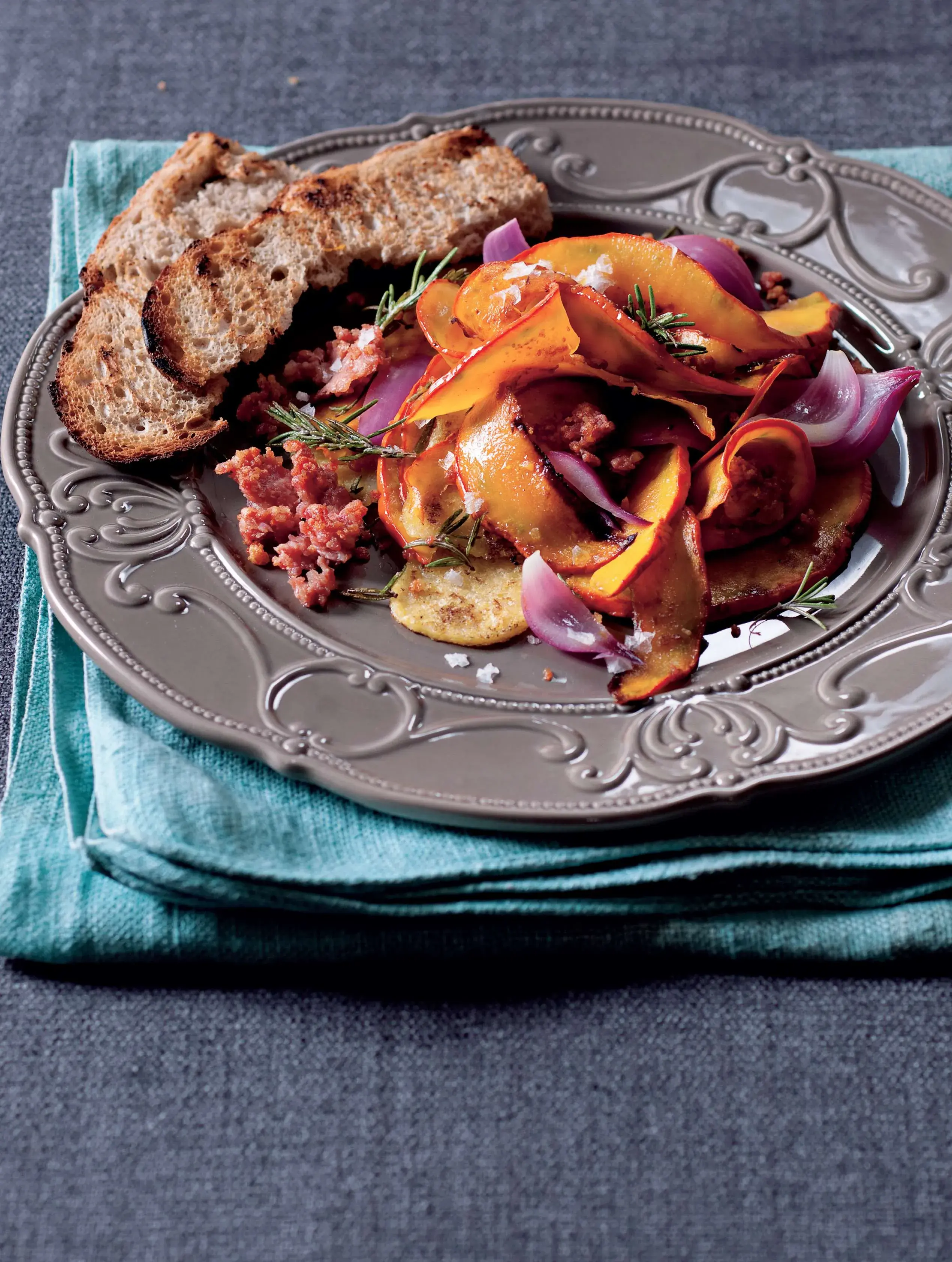 Loďky z červené cibule na dýňových vlnách. S opečeným chlebem vás tohle křupavé jídlo uhrane, zasytí a rozveselí.