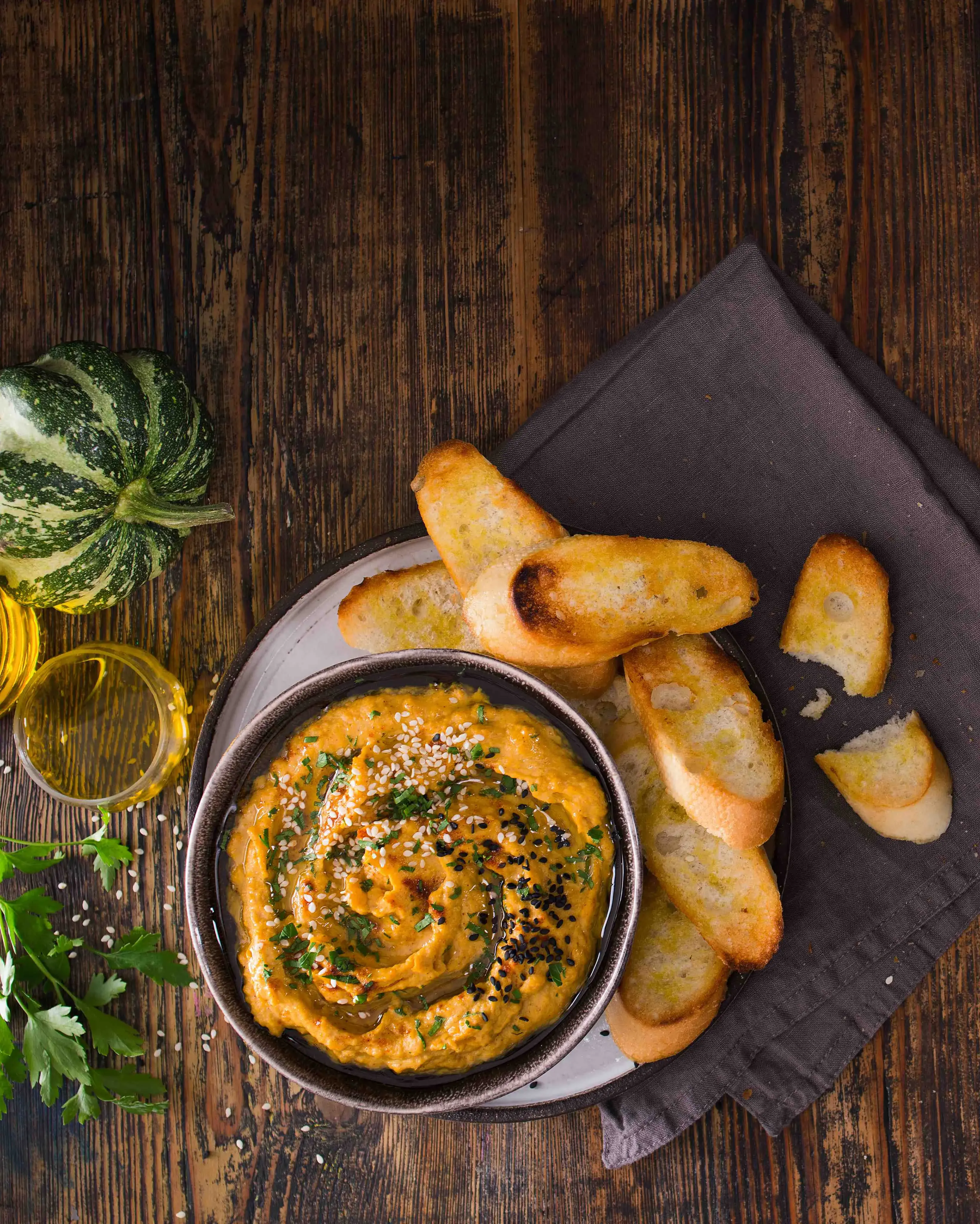 Tenhle hummus se obejde bez cizrny, ale díky sezamové pastě chutná nasládle a výrazně oříškově – nebojte se jej tedy klidně přiostřit.