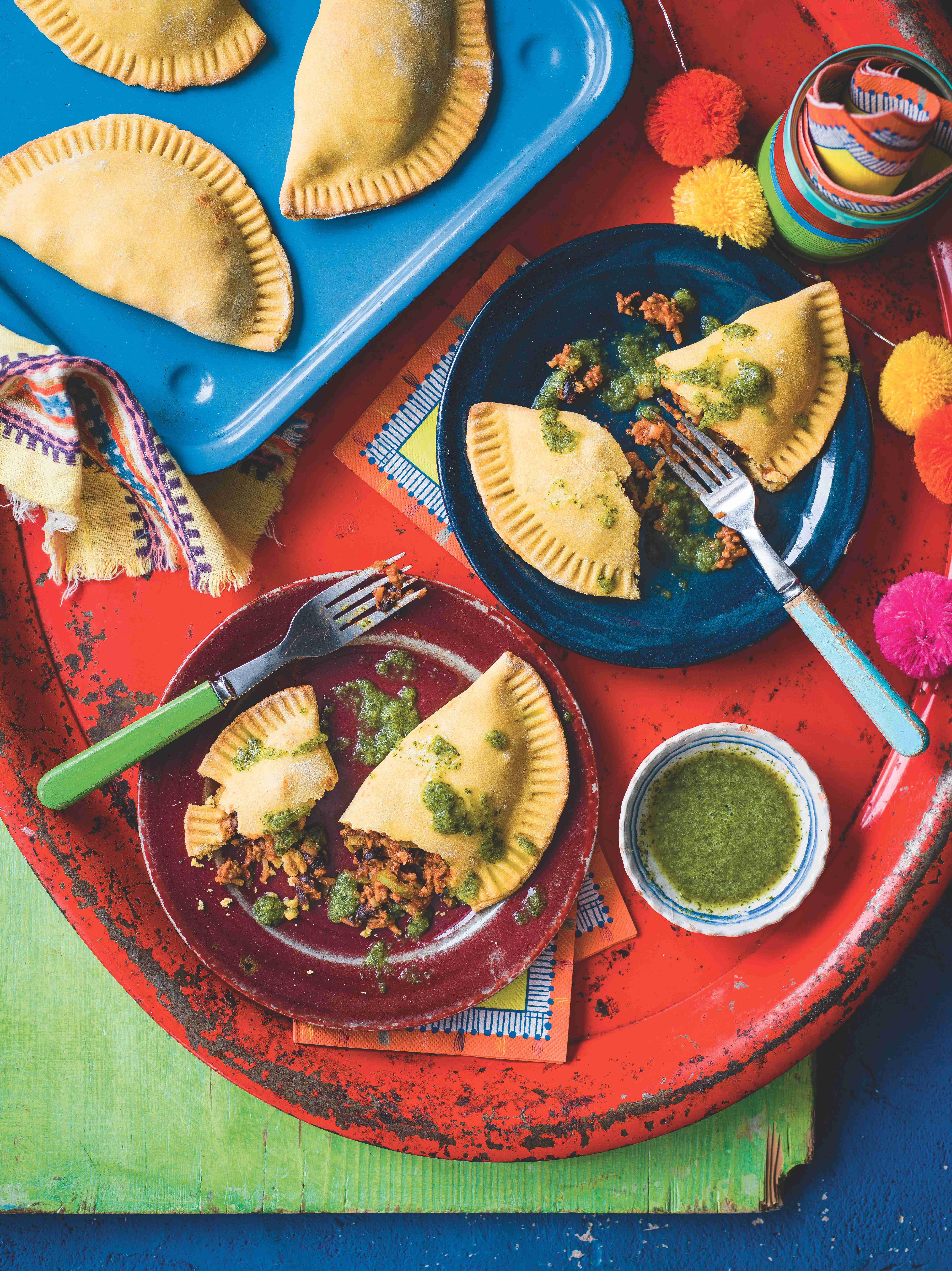 V Ekvádoru jsou velmi oblíbené empanadas de viento (větrné empanady), plněné sýrem a taky spoustou vzduchu. Pak se tu také dělají empanadas de verde ze zelených banánů, plantainů. My jsme ale pro vás vybrali třetí ekvádorské taštičky, empanadas de morocho, nazvané podle jednoho typu zdejší kukuřice – morocho. Jsou plné lahodné náplně s vepřovým masem a doprovází je pálivá omáčka se zelenou chilli papričkou zvaná ají. Abychom je malinko odlehčili, rozhodli jsme se je namísto v Ekvádoru běžného smažení upéct v troubě.