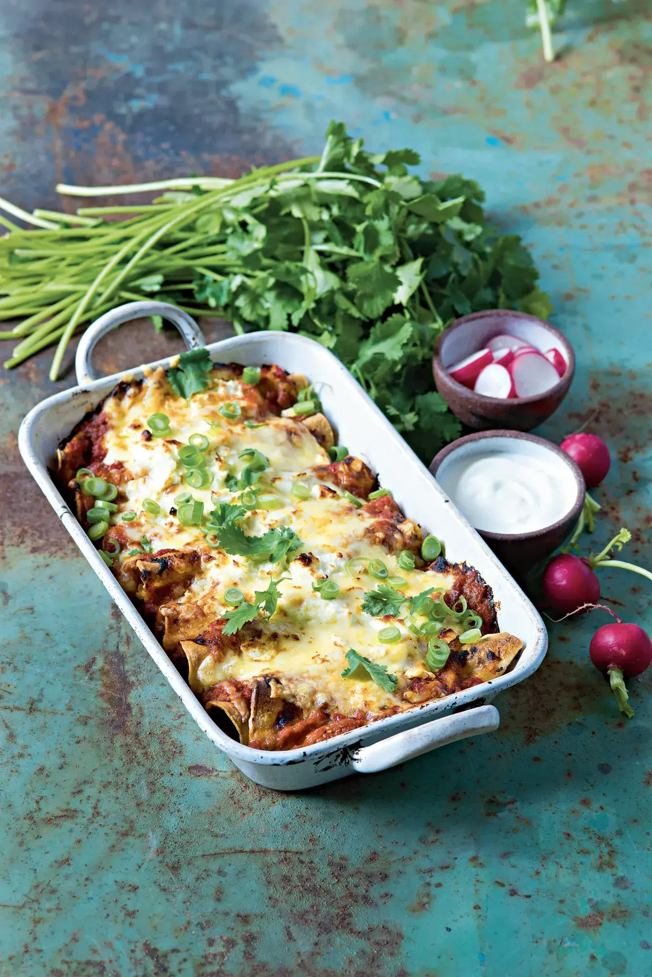 Sladká máslová dýně, šťavnaté kuřecí maso a černé fazole tvoří náplň, která se v tortille krásně propojí s mexickým kořením a zapečeným sýrem. Enchiladas, které vás zahřejí, nasytí a díky jedné zapékací míse udělají z vaření příjemně nenáročnou záležitost.