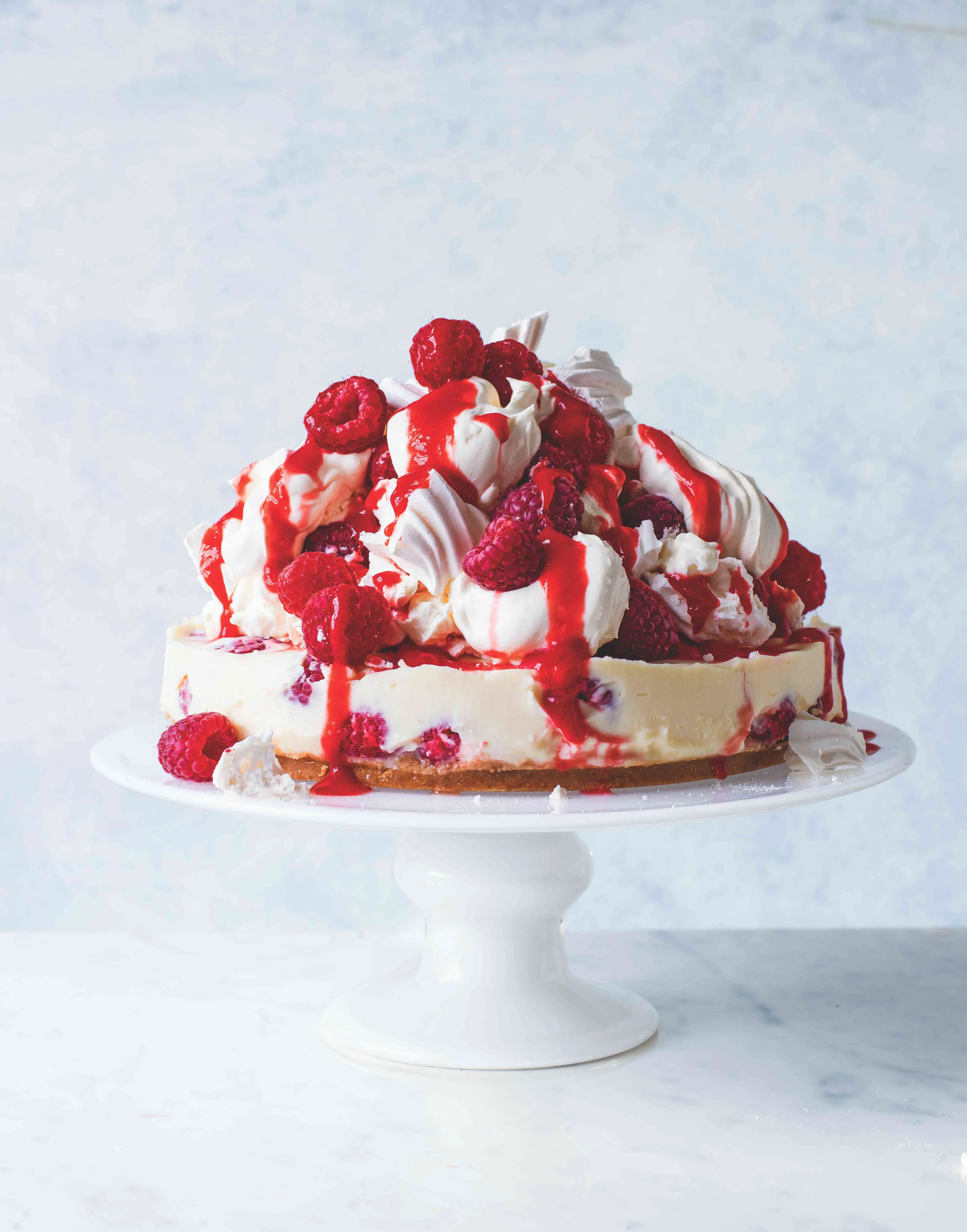 Letněji a vzdušněji už to snad ani nejde: cheesecake ozdobený pusinkami, šlehačkou a malinami. Oh-la-la!!!