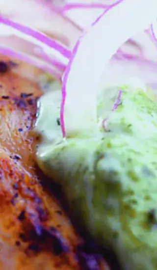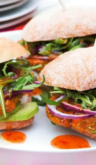 Burgery z cizrny, česneku a bylinek. Podávejte s opečenou pitou a rajčatovou omáčkou.