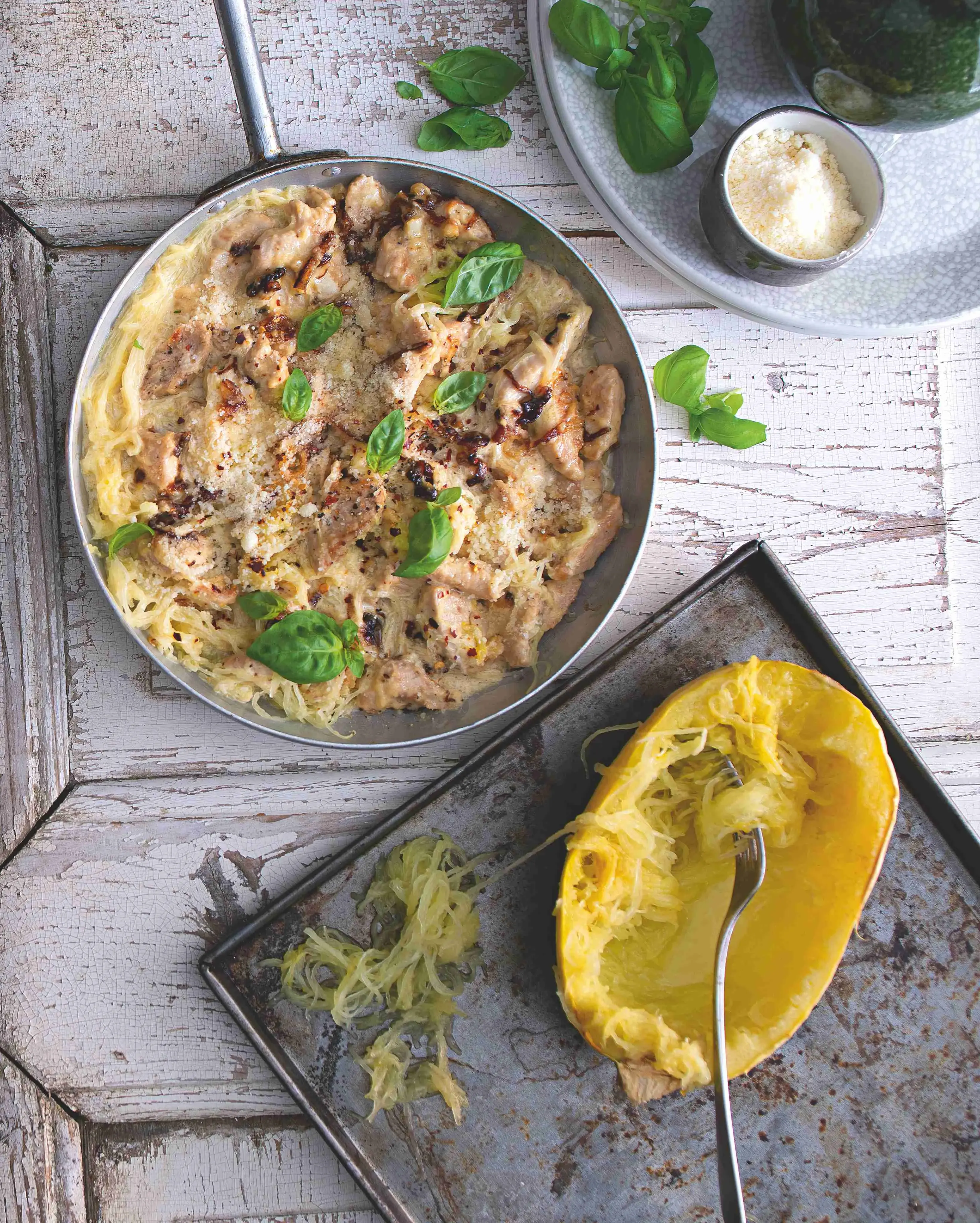 Původní italský domácký pokrm fettuccine Alfredo, tedy široké nudle s máslem a parmazánem, prošel ve Spojených státech proměnou, dostal se na jídelníčky restaurací a přibyla v něm smetana, česnek a také kuřecí maso či krevety. Naše bezlepková (pokud si ohlídáte majonézu) variace na tohle téma má namísto těstovin ,špagety‘ z pečené dýně a smetanu v ní nahrazuje majonéza.