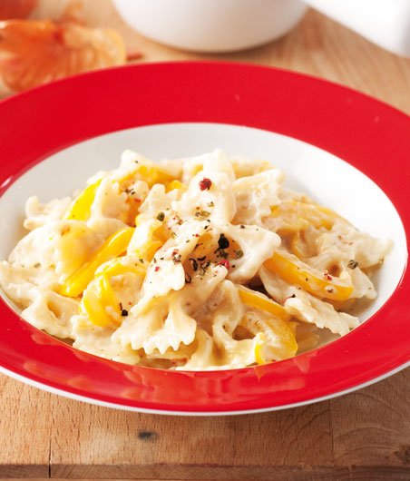 Žluté papriky rozzáří těstoviny ve tvaru motýlích křídel.