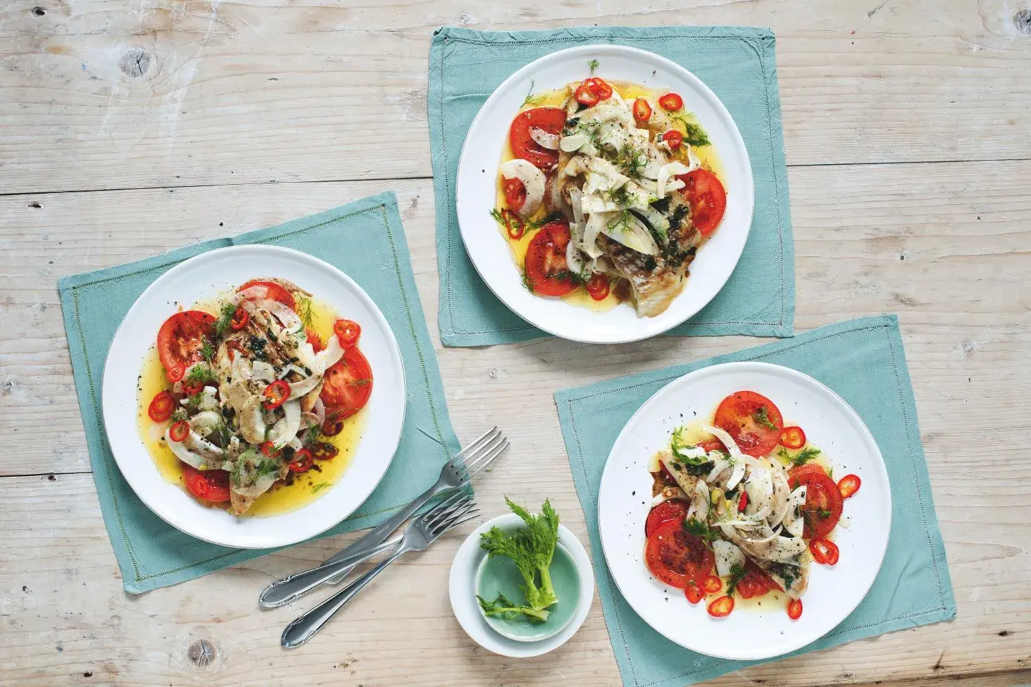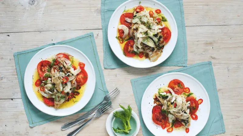 Jak říká Jamie Oliver, na tomhle receptu je úžasný kontrast čerstvé chuti salátu a horké grilované ryby. Výborně spolu ladí, je to osvěžující a skvěle to vypadá. Vyberte jakoukoli rybu, která je vhodná na grilování – v obchodě vám poradí.