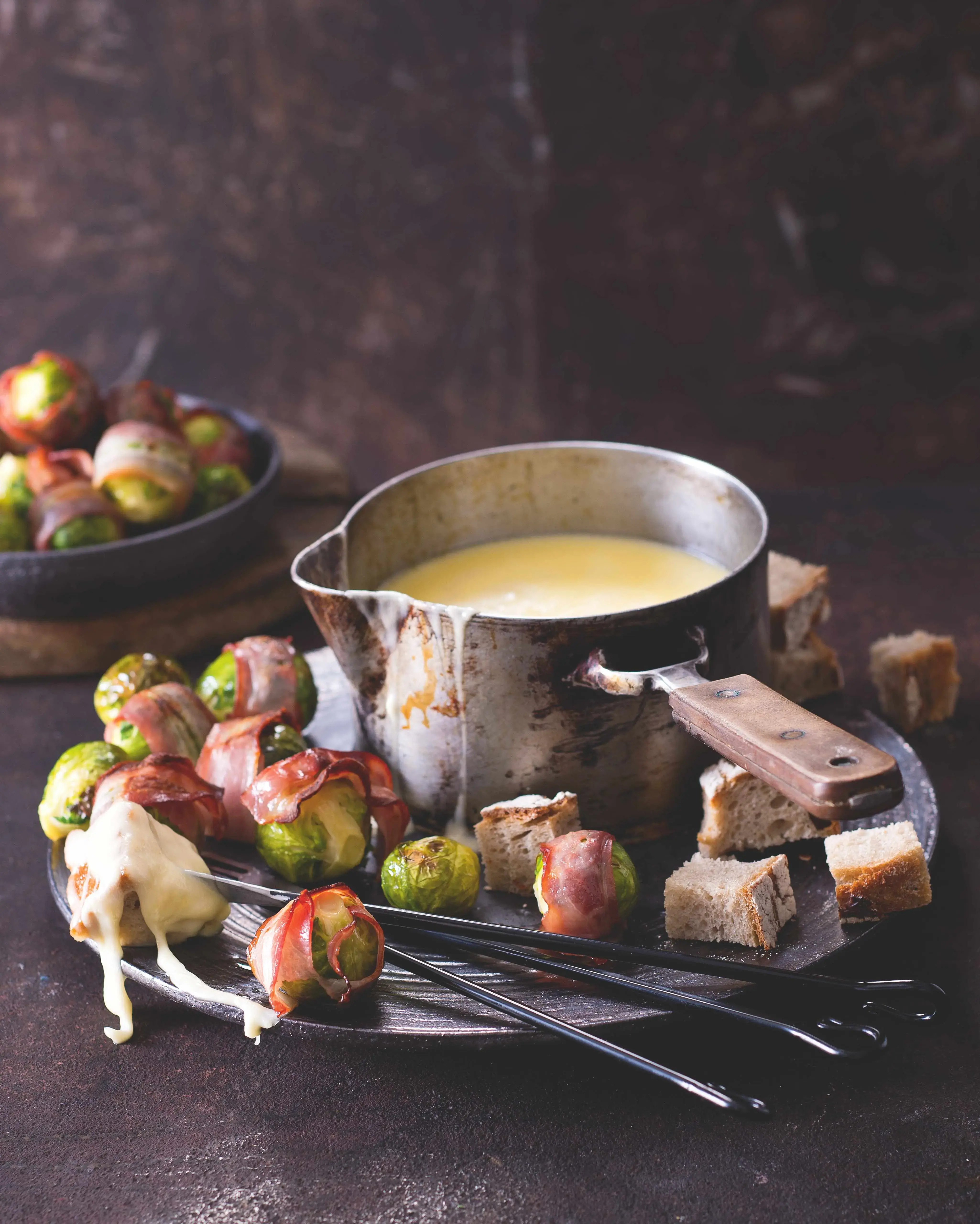 Do rozpuštěného sýra nemusíte namáčet jen chleba. Růžičková kapusta je mnohem zdravější, v kombinaci se slaninou navíc dodá fondue další chuťový rozměr.