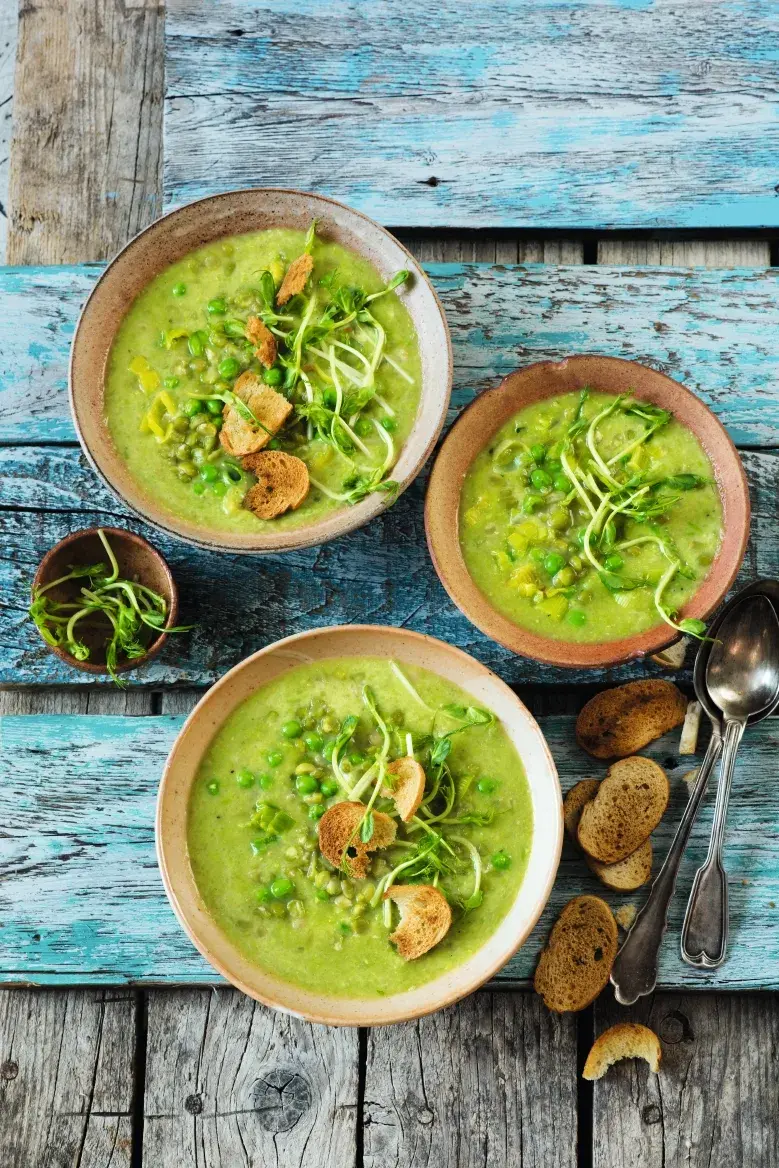 Hrachovou polévku ze sušeného hrachu i tu hráškovou z čerstvého či mraženého zeleného hrášku zbožňujeme. Každá je jiná, obě jsou skvělé. Tato francouzská hrachovo-hrášková polévka jejich kouzlo spojuje v jeden dokonalý mix. Aby hrášku nebylo málo, doporučujem hráškové výhonky k podávání. Dodají polévce ten správný šmrnc.