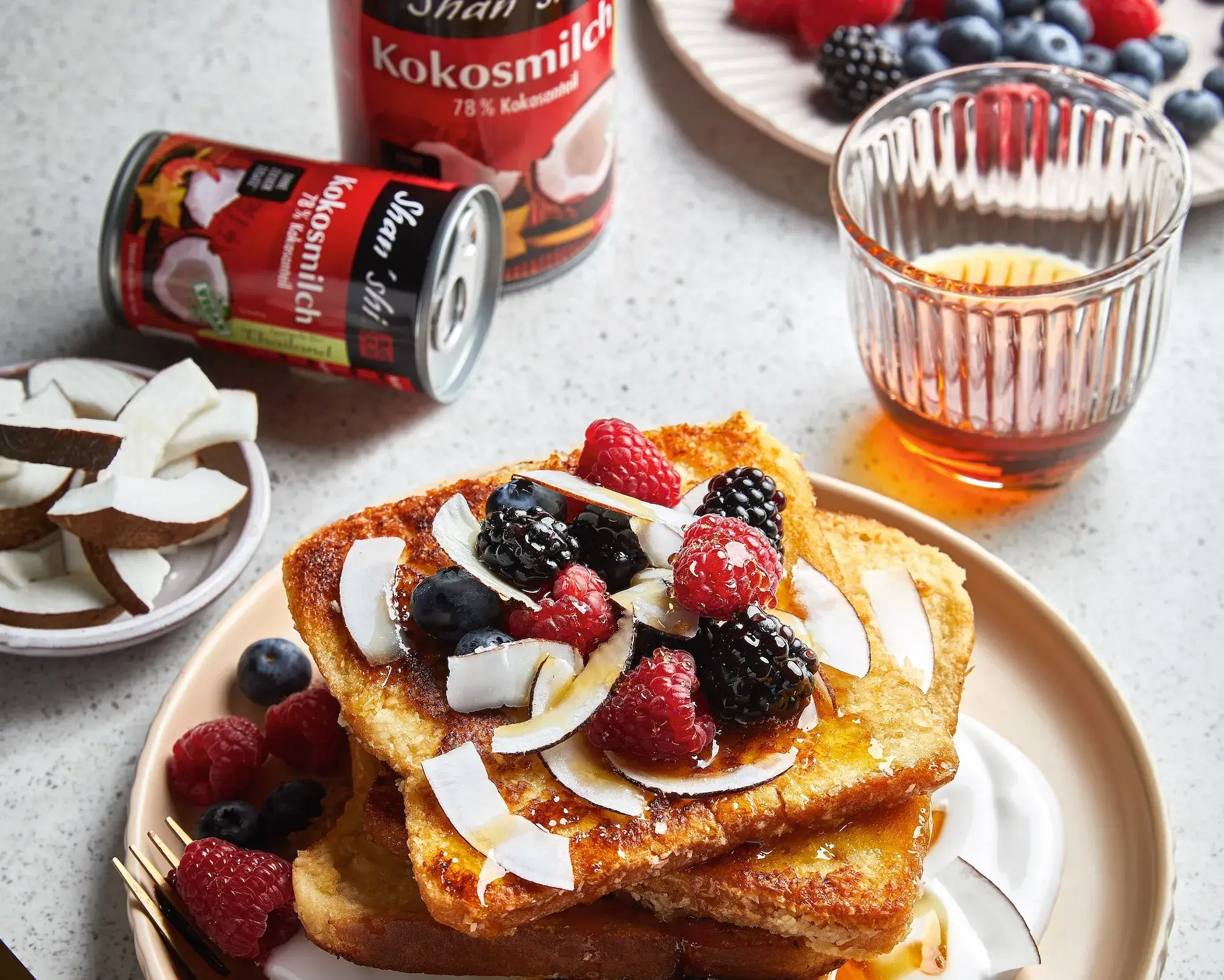Na francouzský toust nemusíte chodit do kavárny. Snadno ho připravíte doma a využít můžete i starší pečivo. Vyzkoušejte tuto netradiční verzi s kokosovým mlékem a zasoutěžte si o balíček produktů Maresi. Kokosové mléko a kokos vás přenesou do tropického ráje! Příště místo lesního ovoce vyzkoušejte třeba flambovaný ananas.