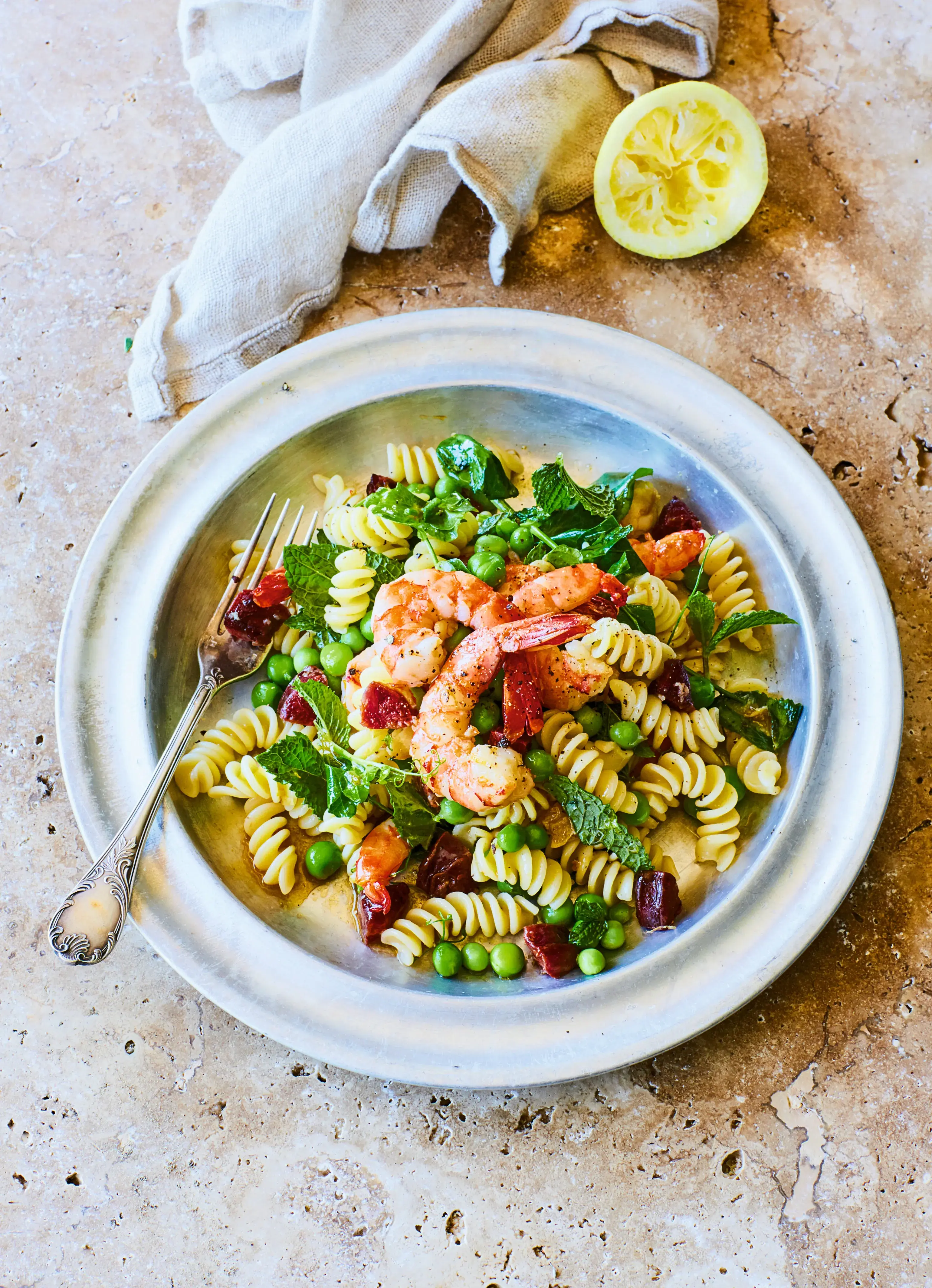 Fusilli s krevetami, chorizem a hráškem je jídlo hotové téměř za půl hodiny. Navíc k přípravě stačí jen pár surovin. A pokud zrovna nefandíte krevetám, kuřecí maso je směle zastoupí.