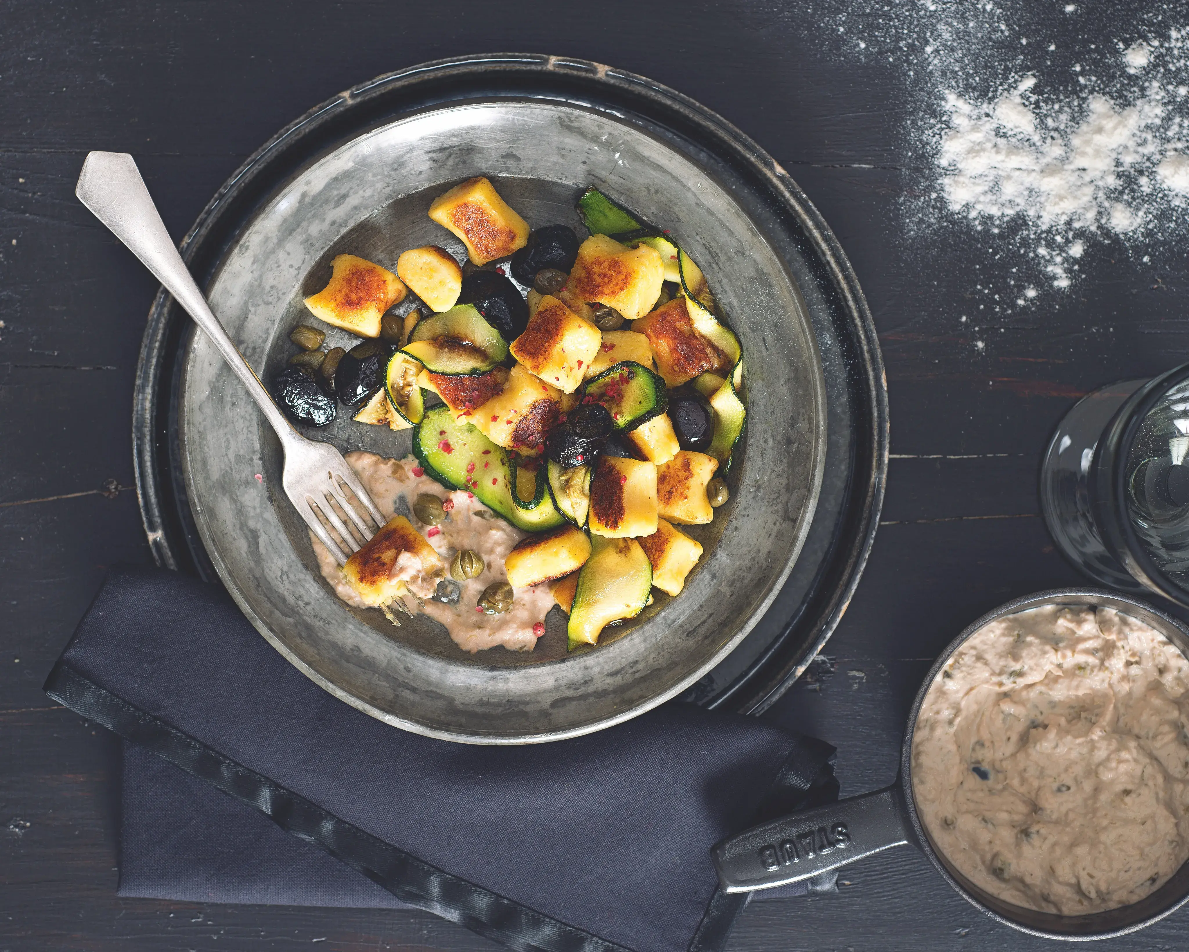 Při přípravě tohoto pokrmu jsme se inspirovali oblíbeným italským receptem na vitello tonnato – plátky vařeného studeného telecího masa zalitého tuňákovou omáčkou. Tuňákové omáčce to ale sluší i s noky a cuketou.