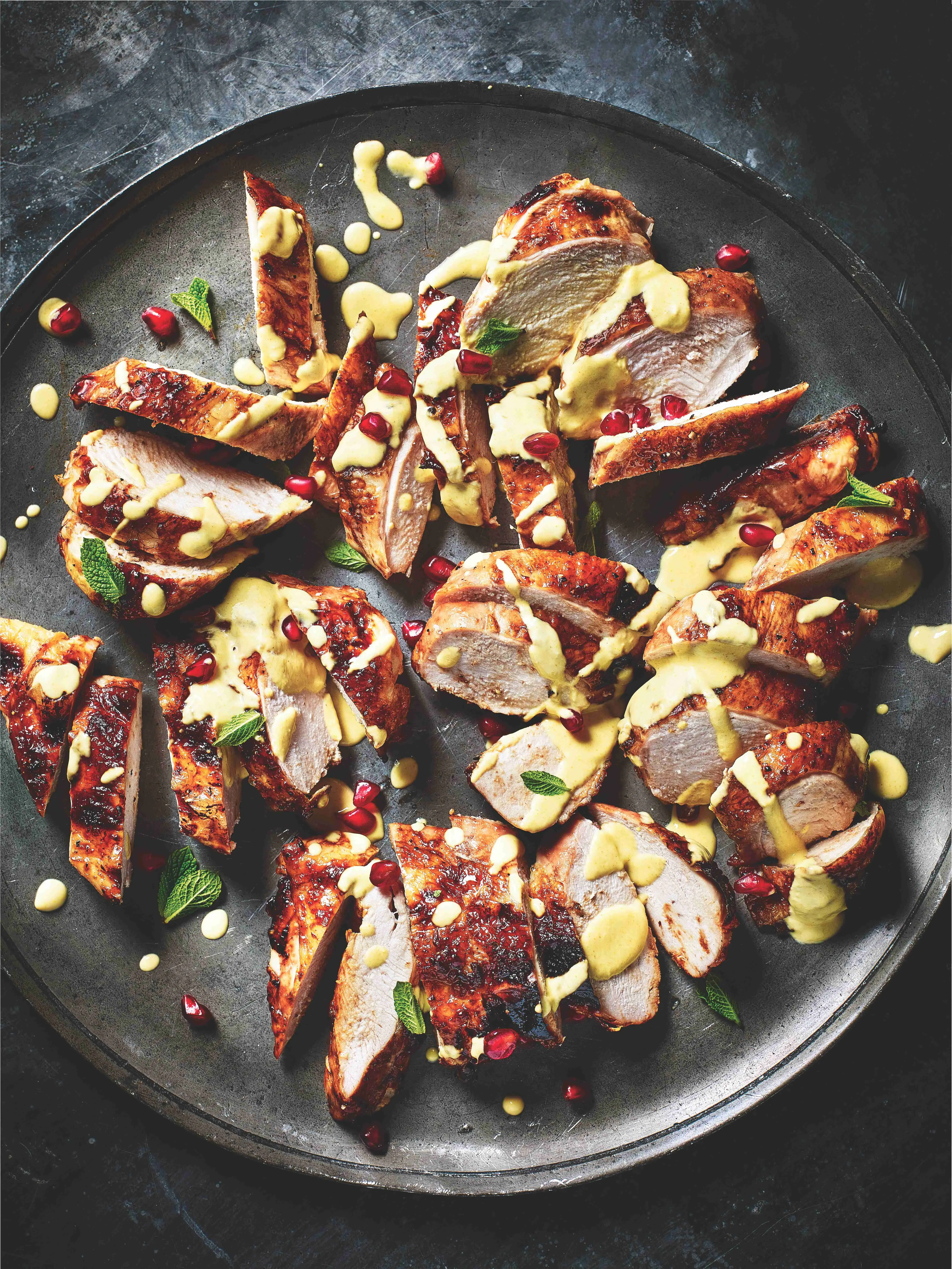 Zpříjemněte si zimu lahodným pečeným kuřetem ozdobeným krémovou omáčkou se špetkou kurkumy a zářivými zrnky granátového jablka.
