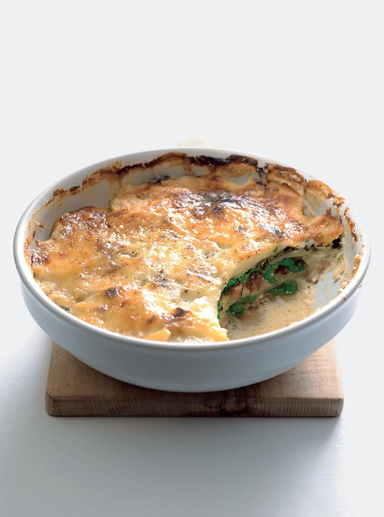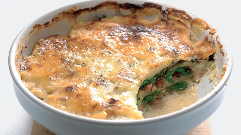 Vydatné jídlo z jednoho pekáče. Kapusta, brambory, voňavá slanina, bylinky a jemná smetanová směs.