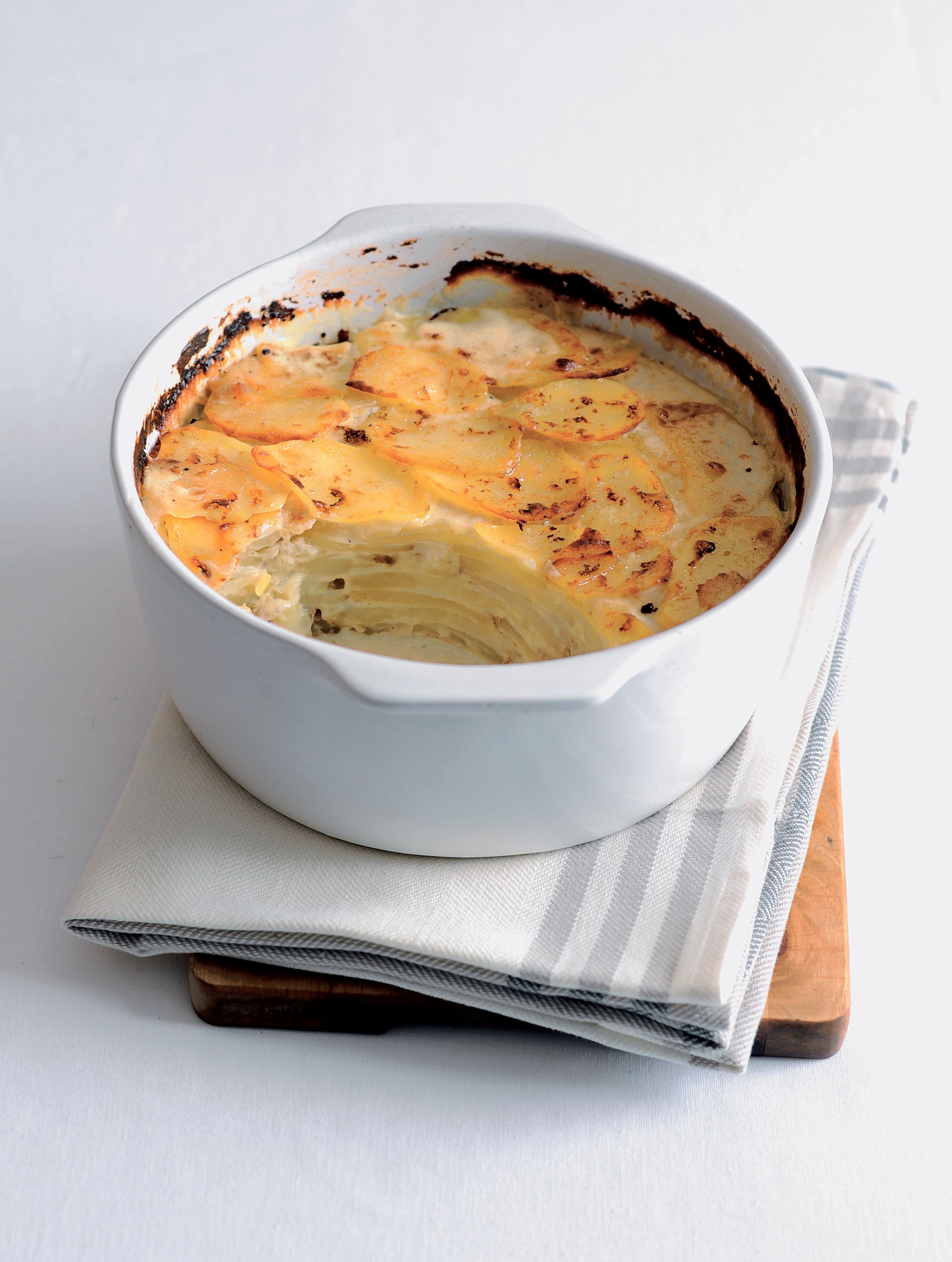 Gratinované brambory představují luxusní přílohu, ale ve větším množství zastanou také roli hlavního jídla. Jejich křupavá krusta je velkým lákadlem ať už v této vegetariánské verzi, nebo ve verzi s kuřecím či vepřovým masem. Sluší jim také brokolice, hrášek nebo kukuřice.