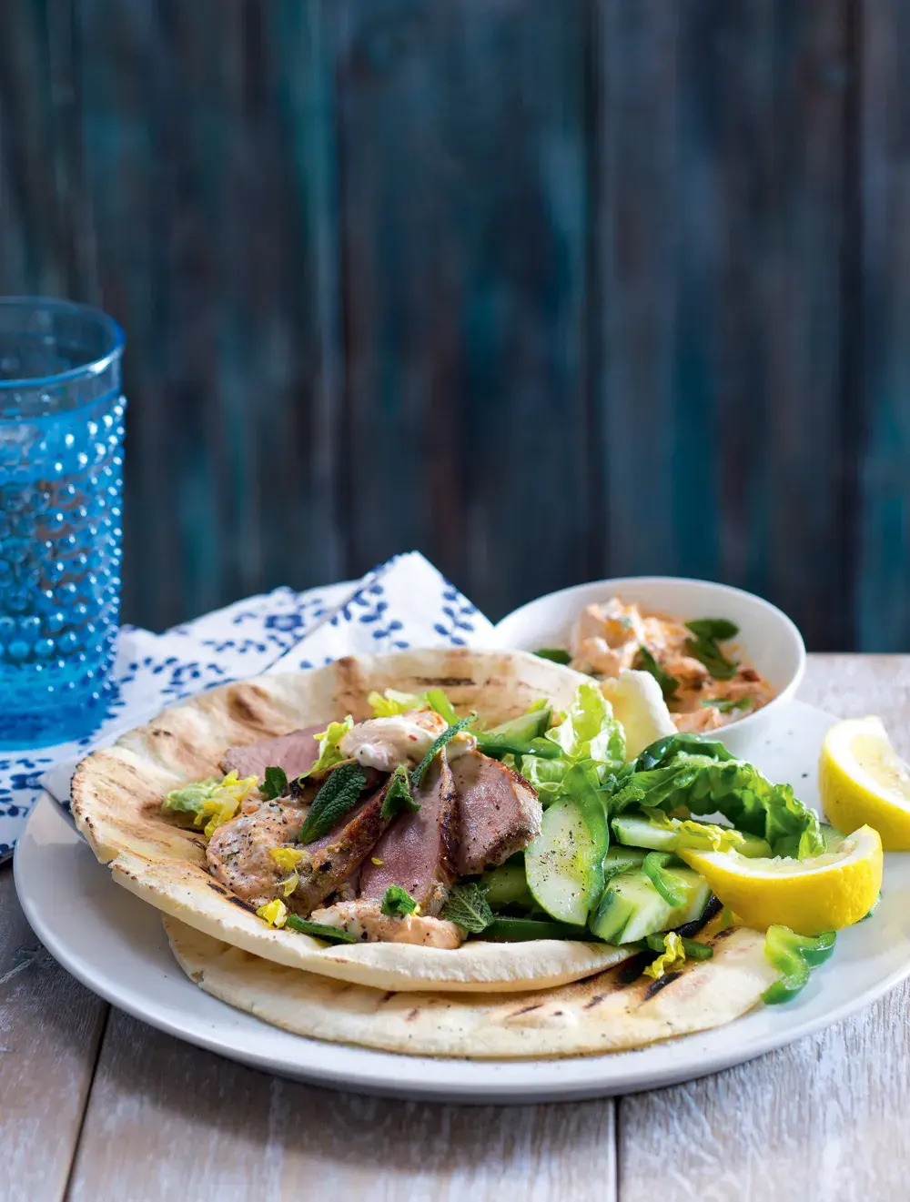 Tenhle recept připomíná klasický gyros – jogurtové dipy jsou v Řecku jako doma! Jogurt je v receptu hned dvakrát – právě díky němu maso zkřehne a při grilování se nevysuší.