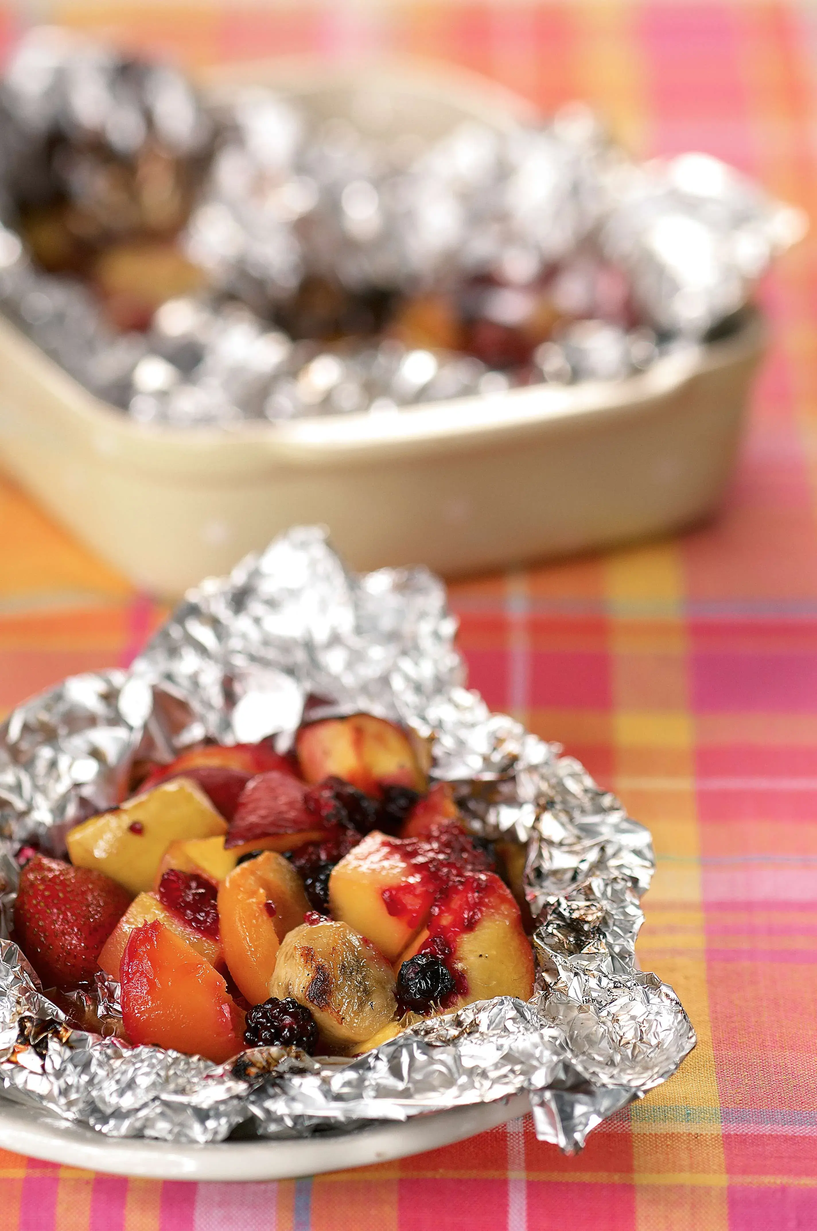 Balíčky plné ovoce můžete připravit dopředu, nechat v lednici a grilovat až těsně před podáváním. Budou pak ještě lepší! Pokud zrovna nemáte po ruce rozehřátý gril, pomůže vám horká trouba. Stačí deset minut a plech vyložený pečicím papírem – máte tak záruku, že se alobal nepotrhá a šťáva nevyteče.