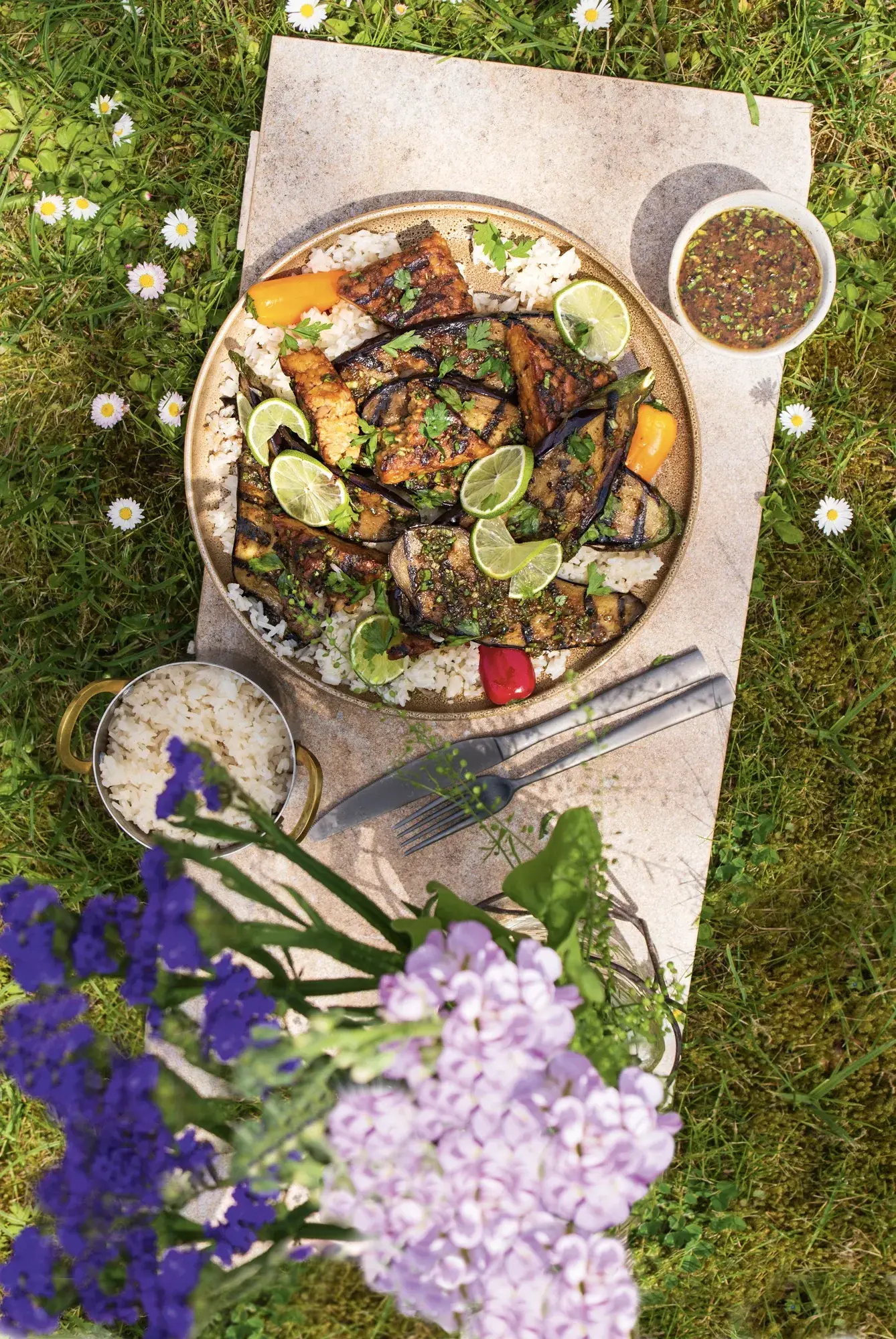 Co hodit na gril místo steaku? Co takhle zeleninu? Lilek je k tomu jako stvořený. Výrazná kořeněná marinádu mu náramně sluší a společně s tempehem a kokosovou rýží tvoří syté hlavní jídlo. Rychlá večeře z grilu a přitom bez masa!