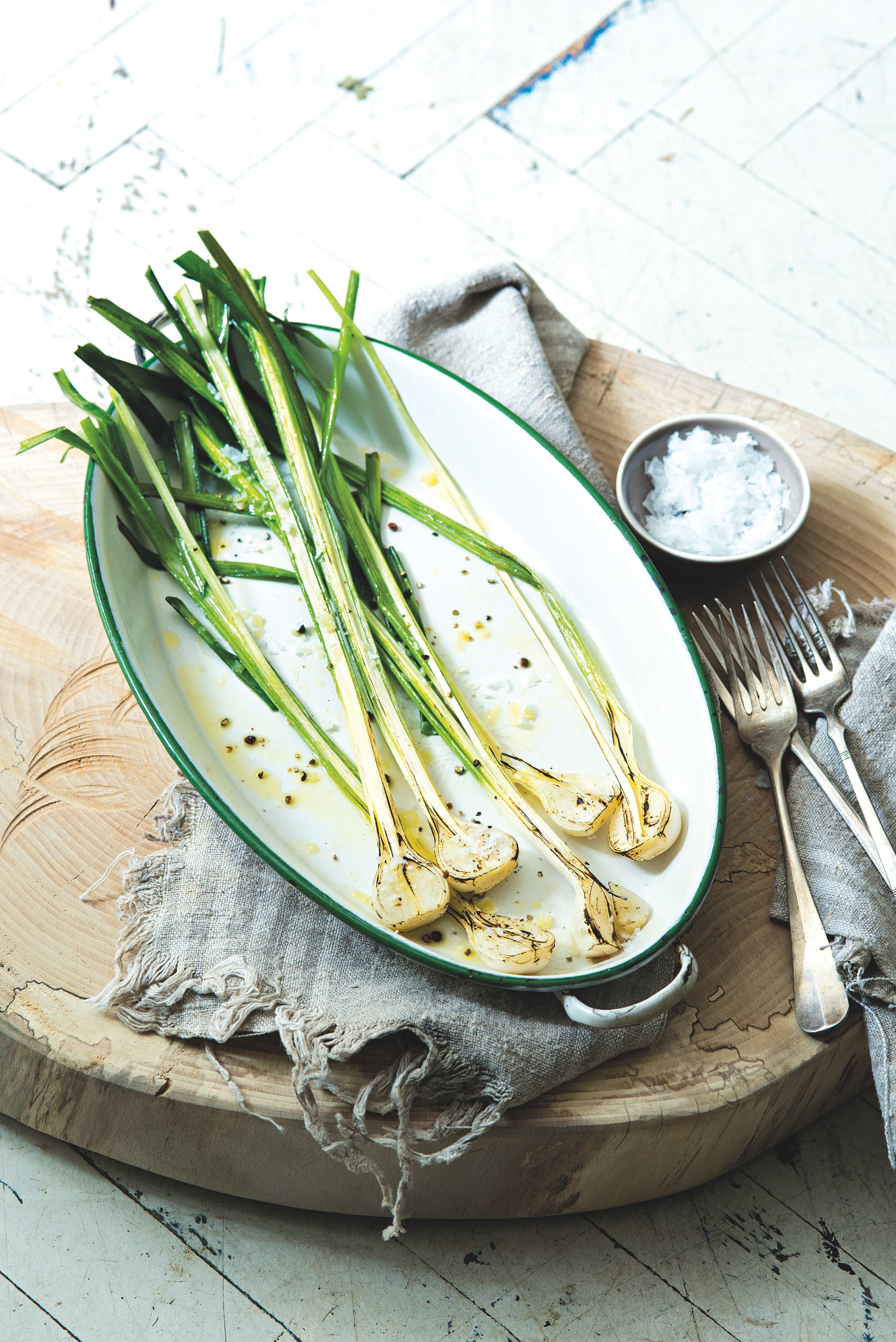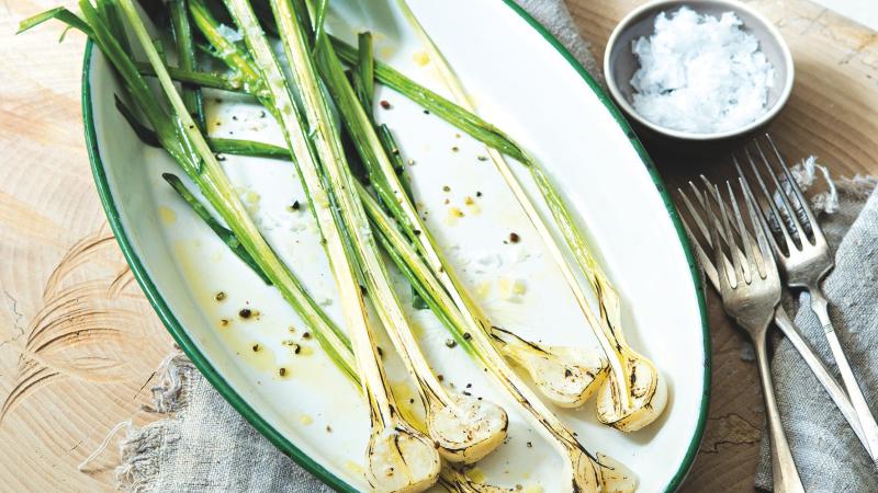 Když je česnek ještě mladý, dá se jíst (skoro) celý, podobně jako jarní cibulky, které jsou vlastně také jen nedorostlé cibule. Opékat ho můžete třeba i venku na grilu. Chuťový zážitek zaručen!