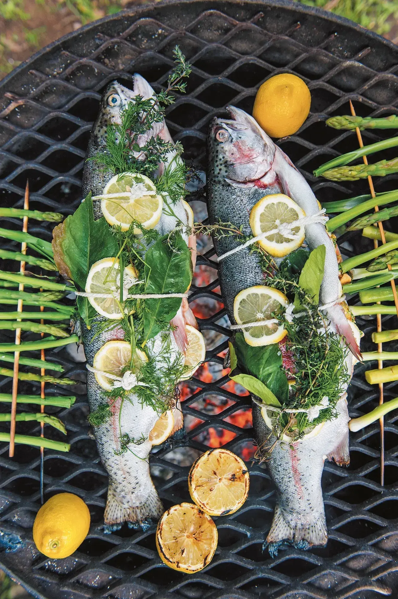 Jak odlehčit letní grilování? Vyměňte flákotu masa za rybu a přidejte také zeleninu. Grilovaný pstruh s chřestem, jarní cibulkou a bylinkami je recept snů. Plný chuti, jednoduchý na přípravu a suroviny. Užijte si léto s přáteli.