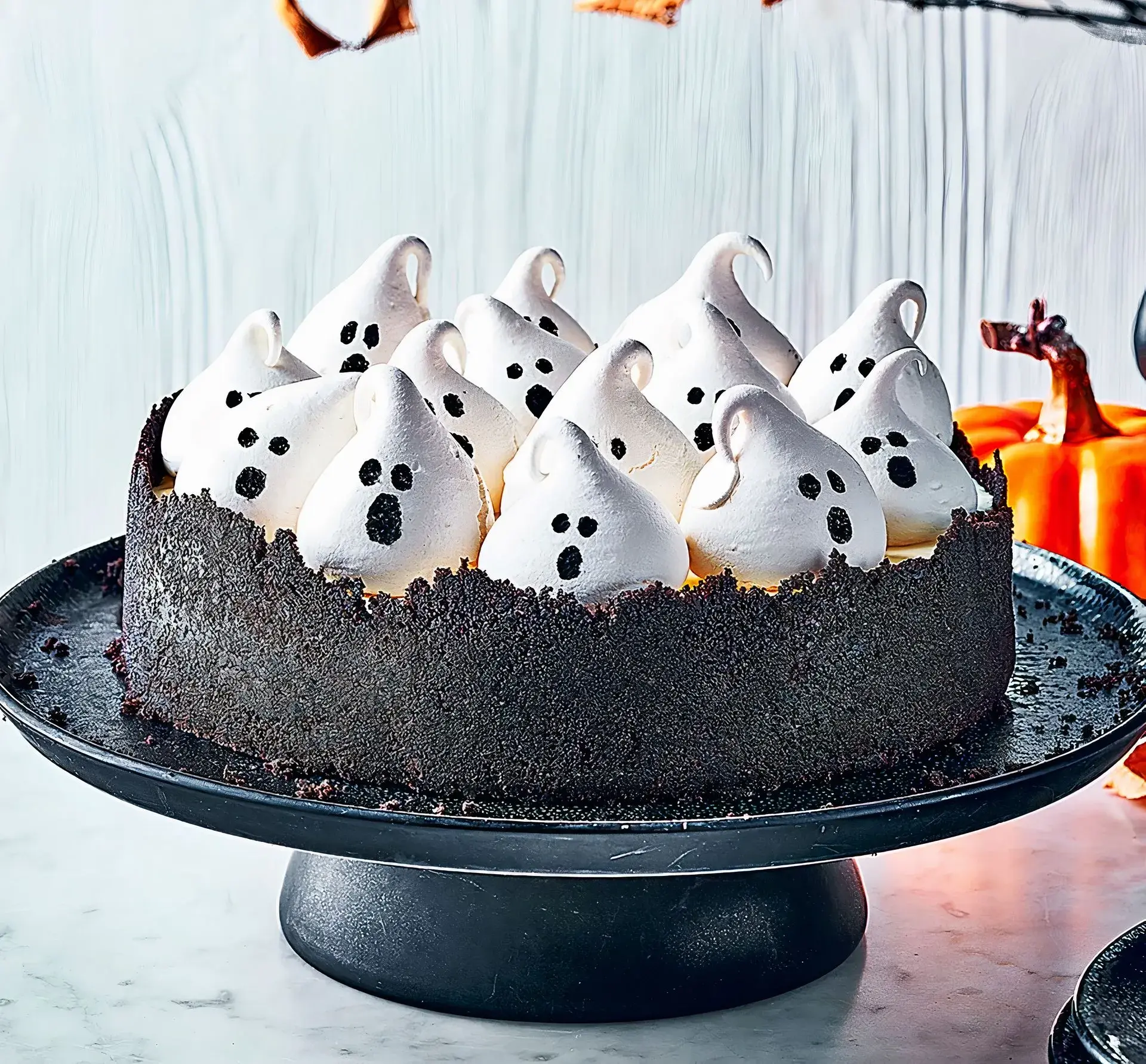 Jednoduchý cheesecake s marshmallow krémem a pusinkovými duchy je jako stvořený pro halloweenskou party. Roztomilý dezert dokreslí strašidelnou atmosféru a každý si na něm pochutná. Zbylé pusinky použijte jako samostatnou mlsku nebo na zdobení jiných dezertů.